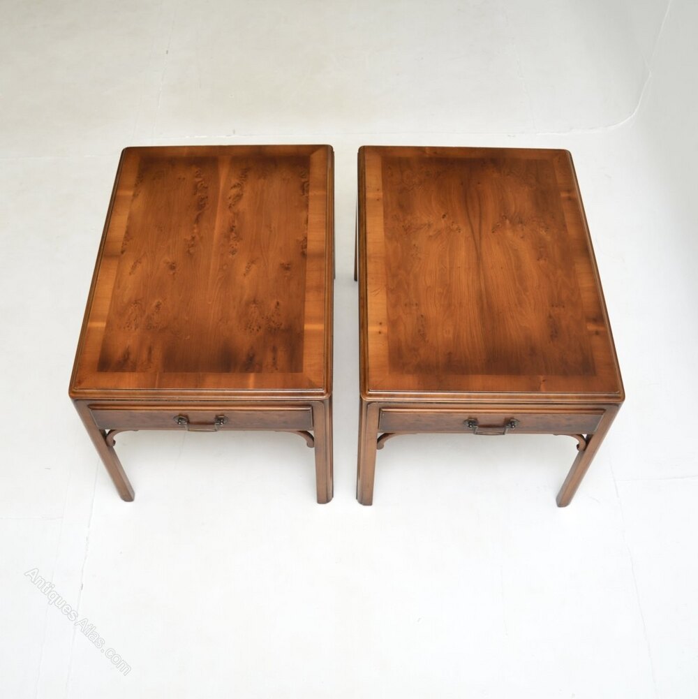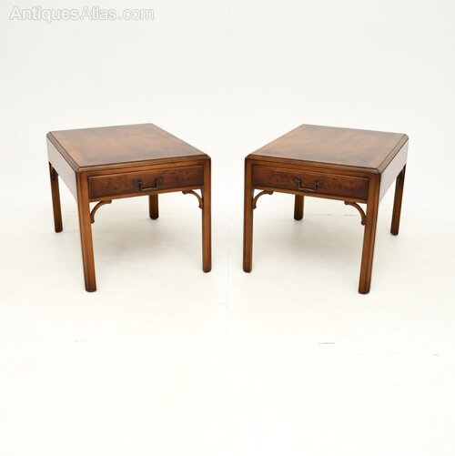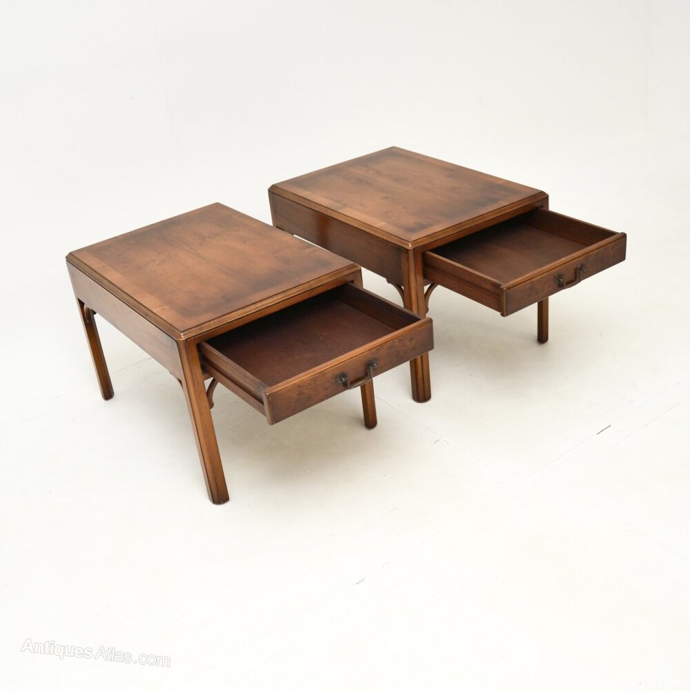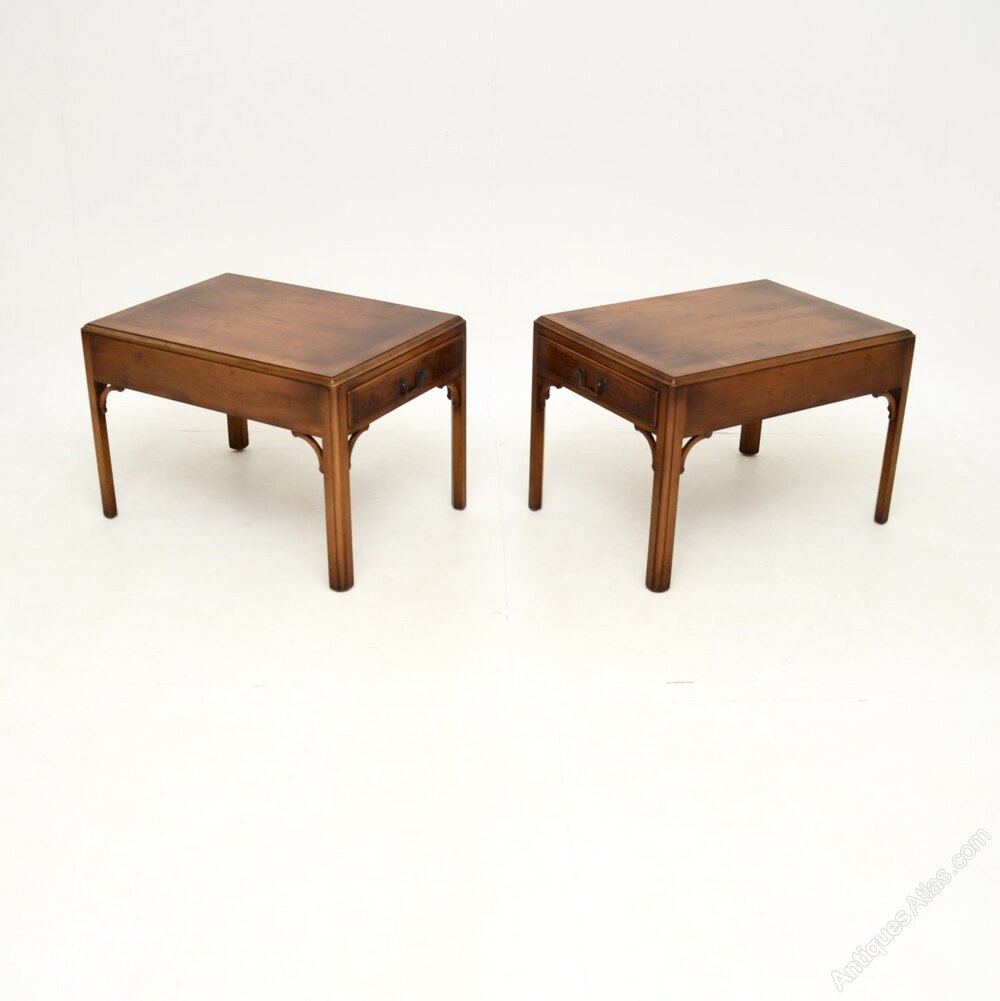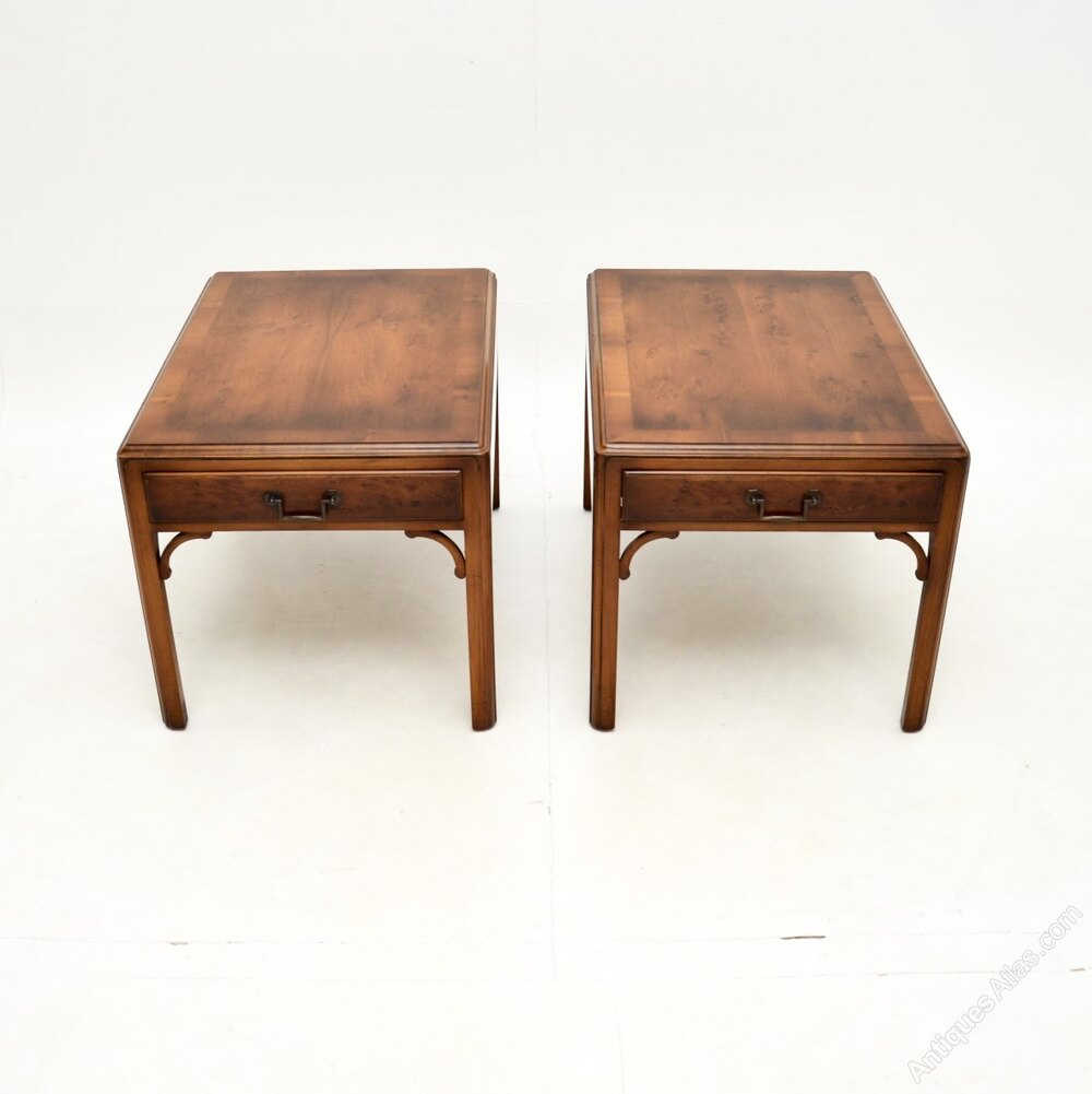 A fantastic pair of antique Georgian style yew wood side tables. They were made in England, they date from around the 1950’s.The quality is outstanding, these are a great size with a single drawer in each table, perfect for use as lamp tables. They are nicely finished on all sides, so they can be used as free standing items. The yew wood has a beautiful colour tone and is offset nicely by the brass handles and fixtures.