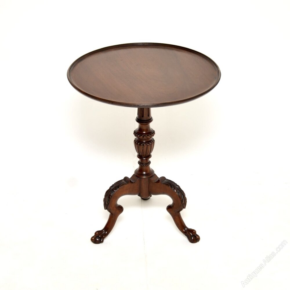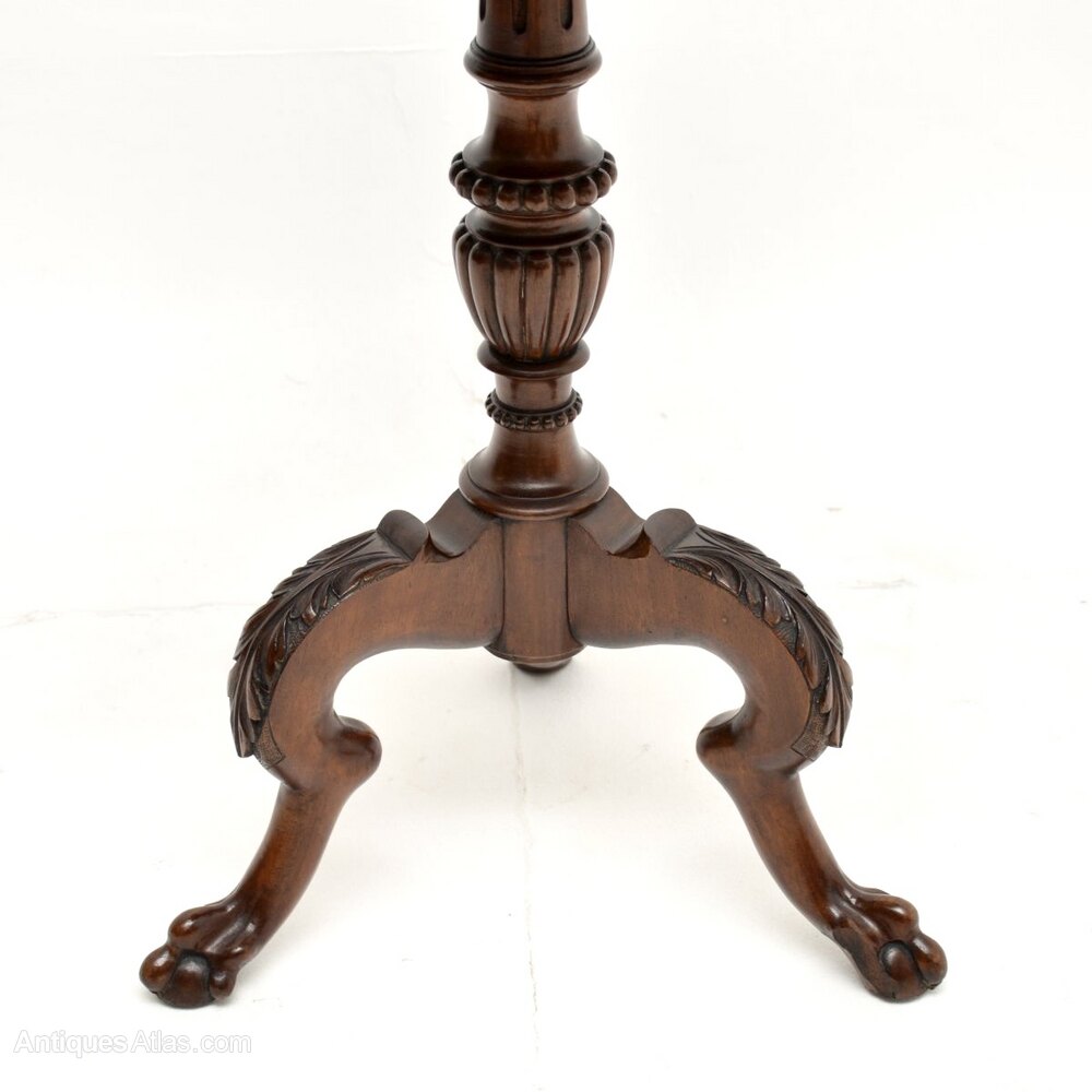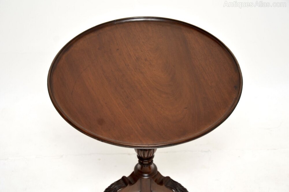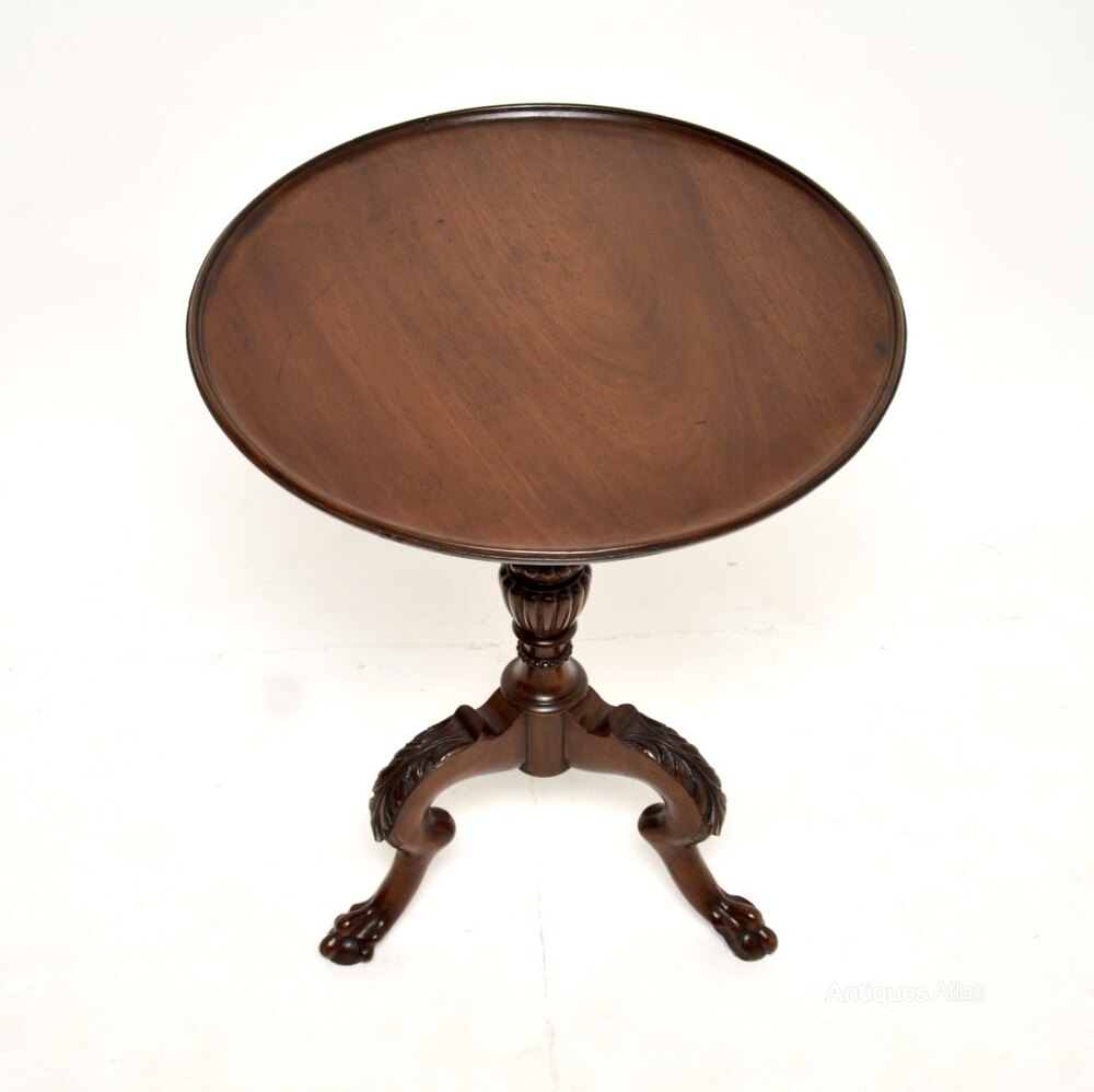 A wonderful antique Victorian mahogany occasional side table. This was made in England, it dates from around the 1860-1880 period.It is of extremely fine quality, with solid mahogany construction throughout. The circular top sits on a beautiful turned and fluted baluster base with carved tripod legs that have acanthus leaf carving at the knees, and terminate in claw and ball feet. The colour tone and patina of the mahogany is gorgeous throughout.