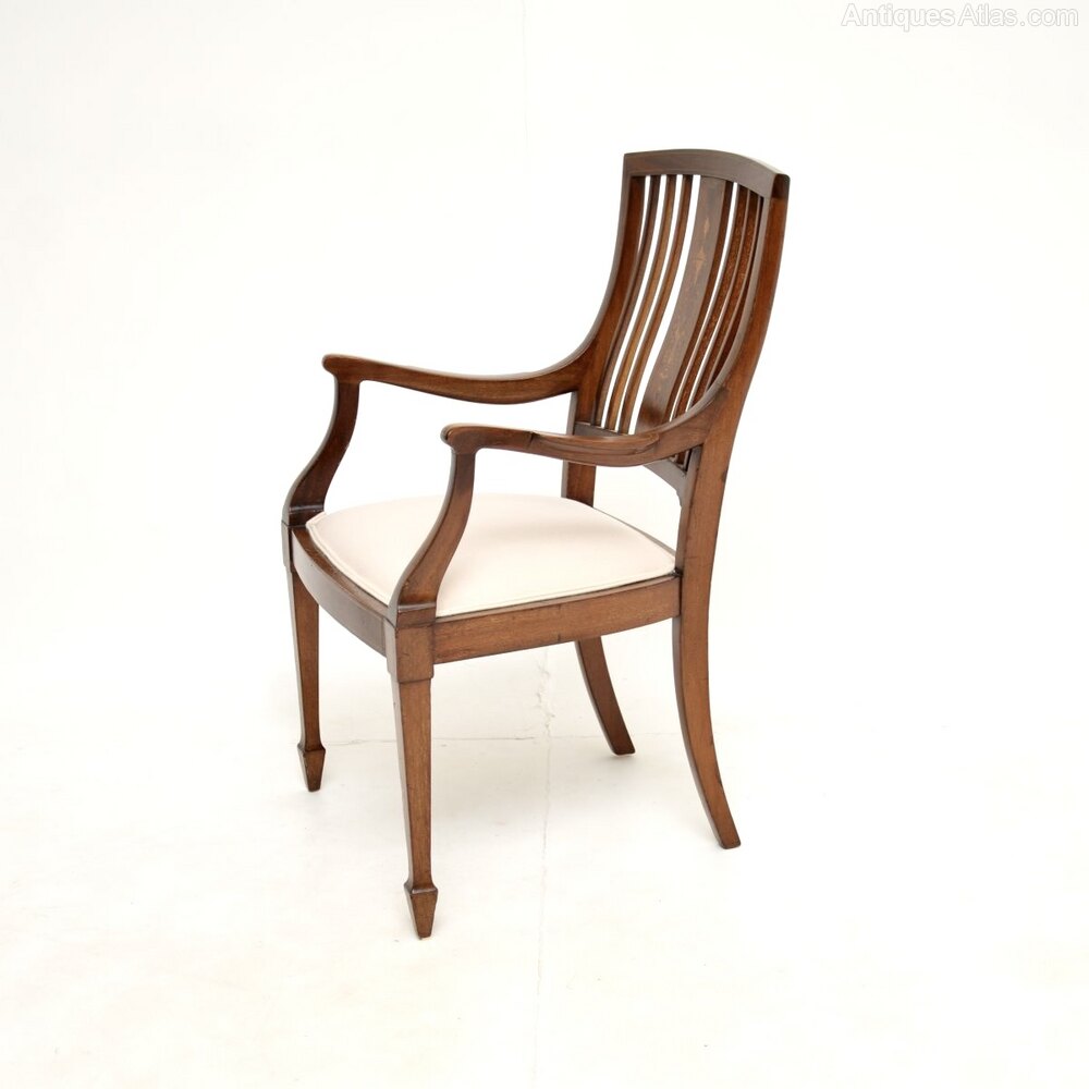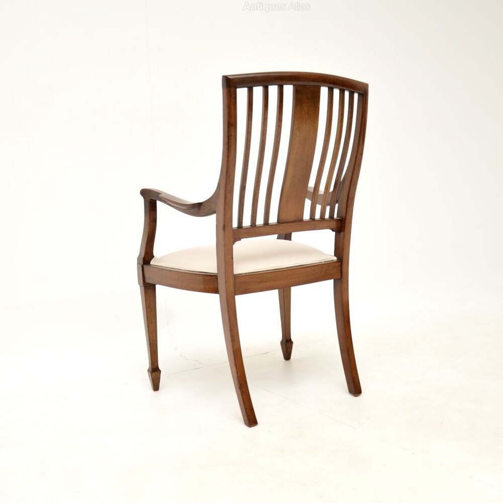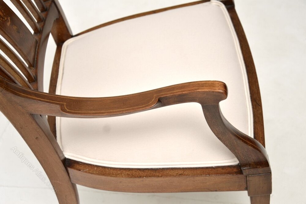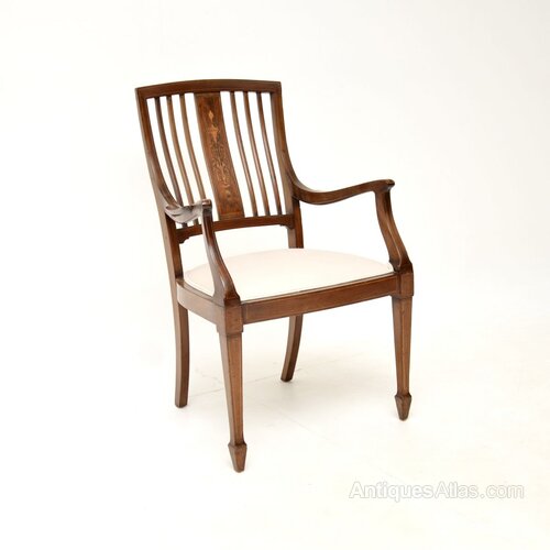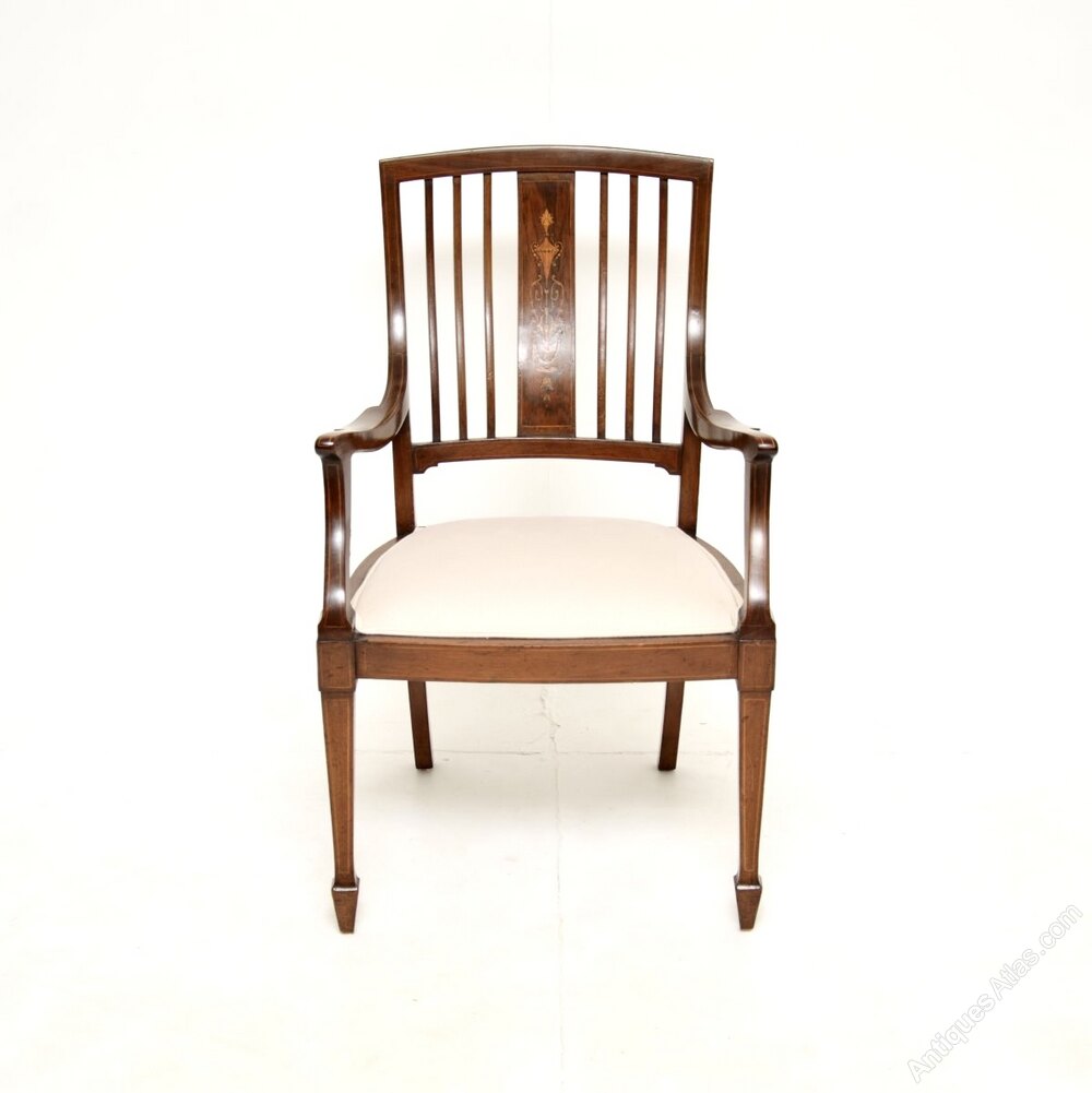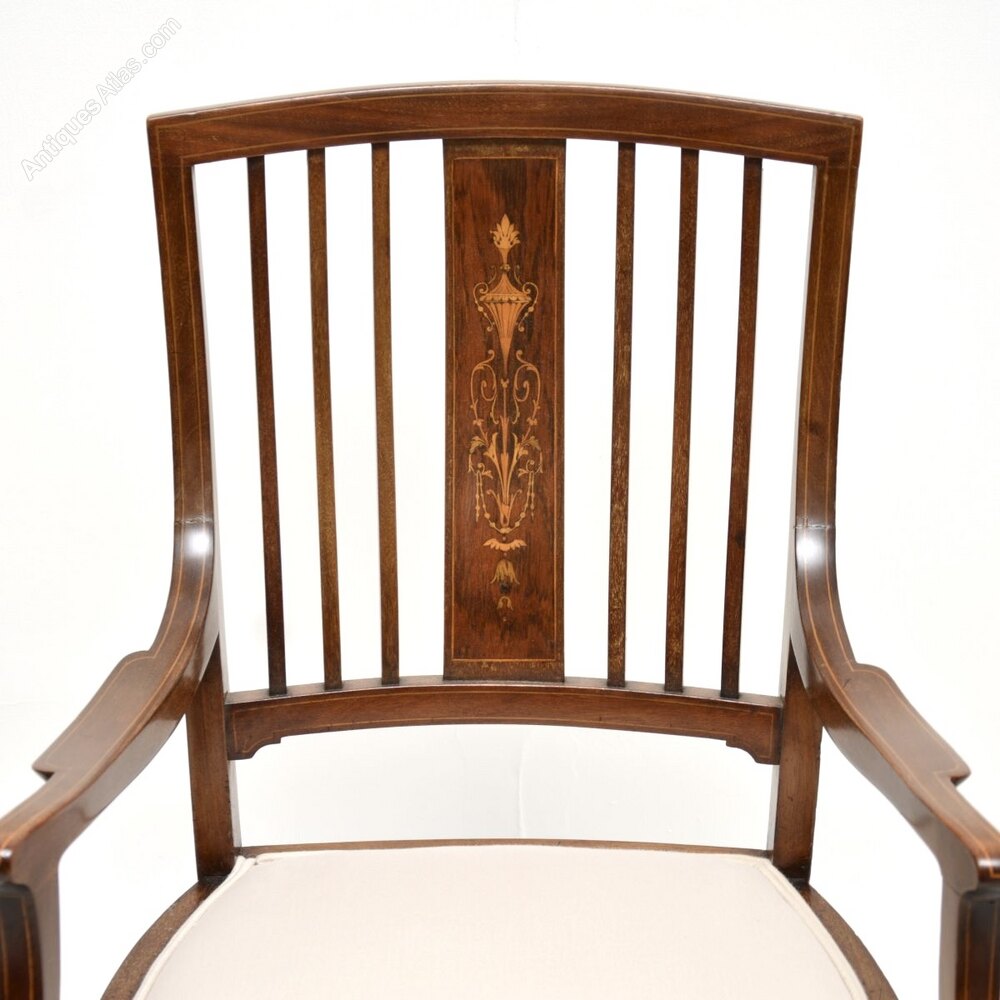 A beautiful and elegant antique Edwardian inlaid mahogany armchair. This was made in England, it dates from around 1900-1910 period.It is of outstanding quality and is very well made. The solid mahogany frame has lots of stunning satin wood inlay on the back rest, arms and legs, with an inlaid rosewood back panel. It’s also structurally very sound, it stands on finely tapered legs terminating in spade feet.