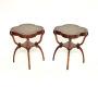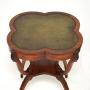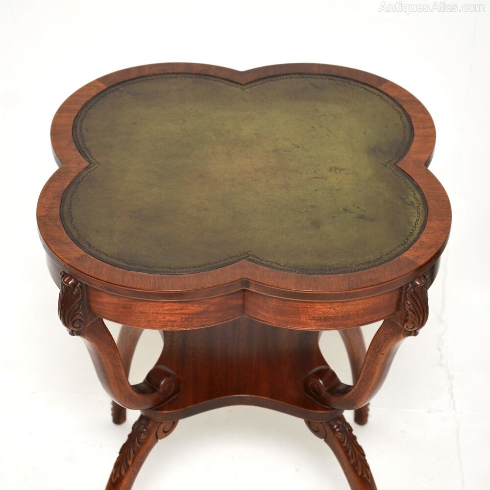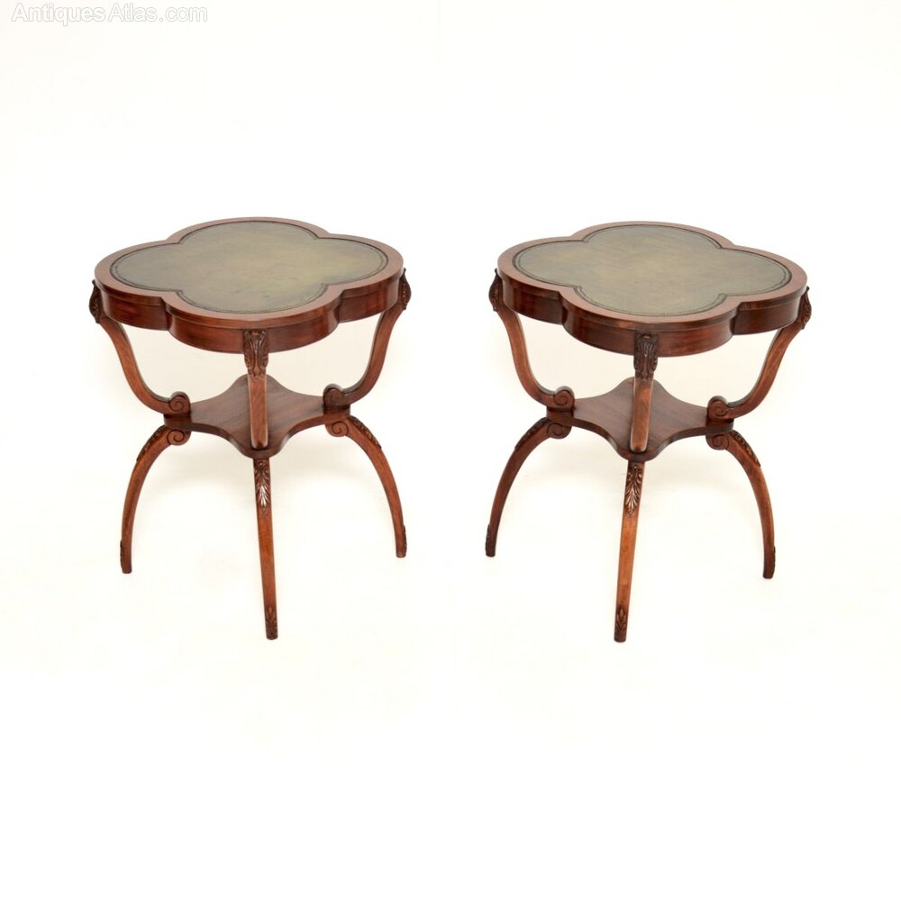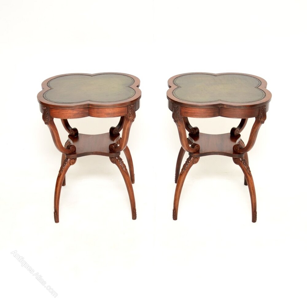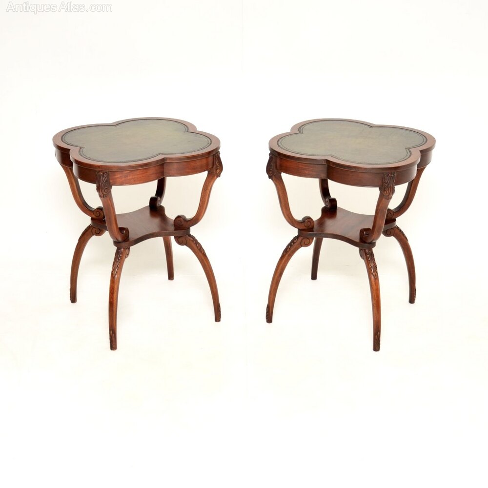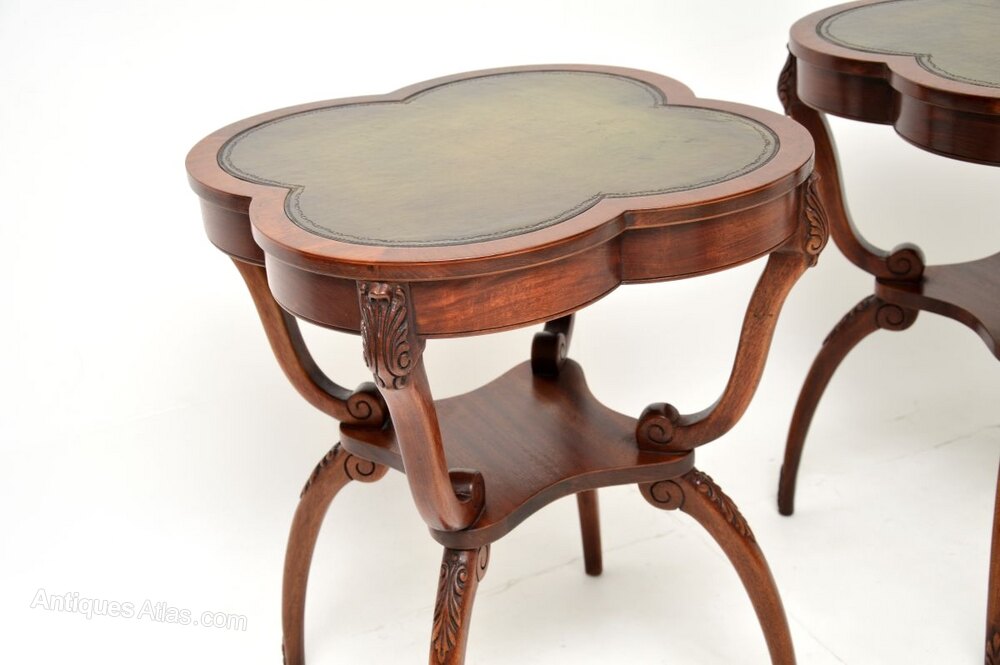 A beautiful and impressive pair of antique mahogany leather top side tables. They were made in England, they date from around the 1920’s.They are of superb quality and are a great size, with generous yet elegant proportions. The tops have a four leaf clover shaped design with inset tooled leather surfaces. They stand on beautifully shaped bases which have lovely carving on the edges, and useful lower tiers.