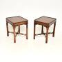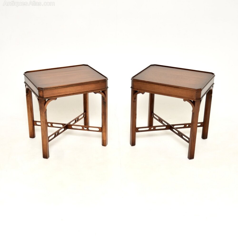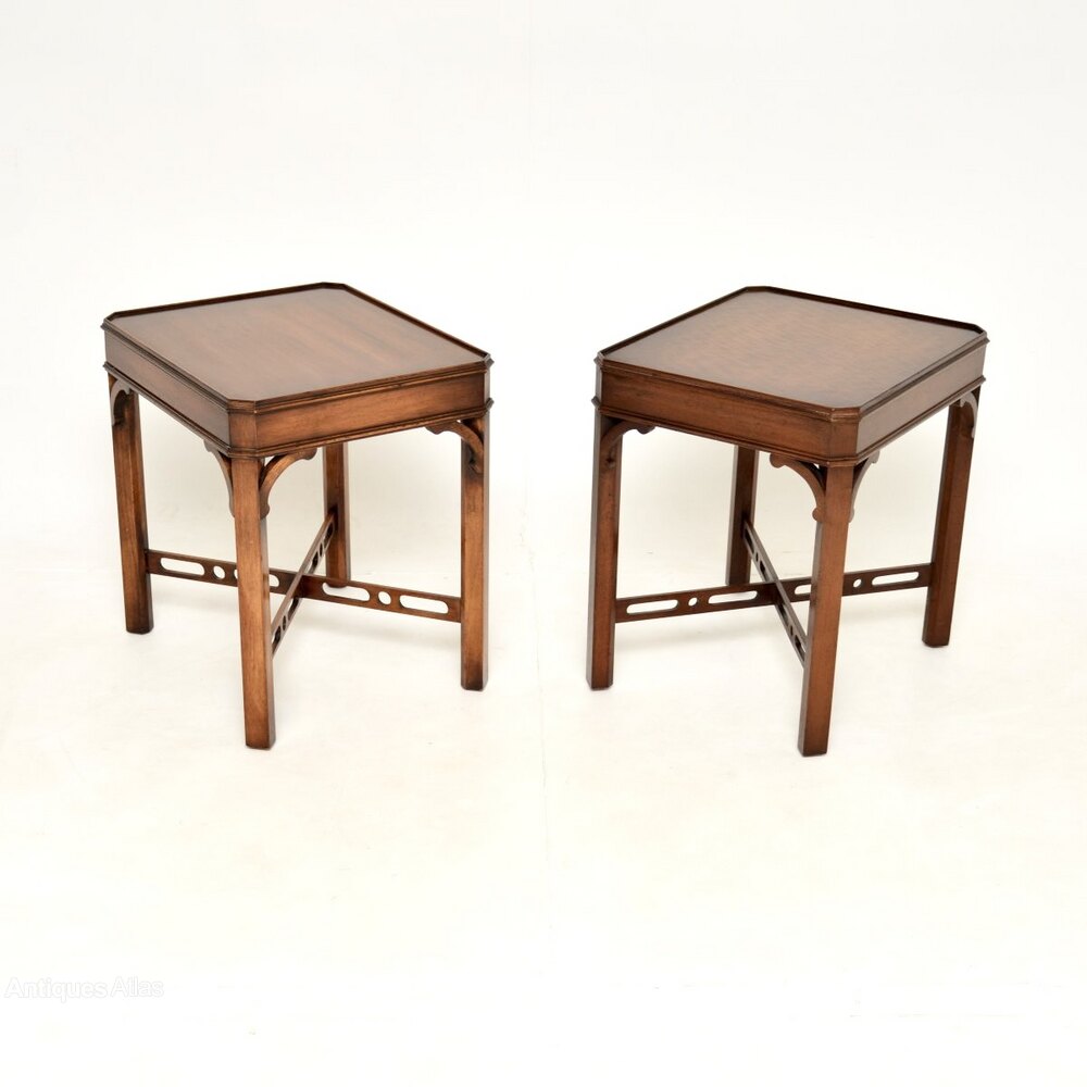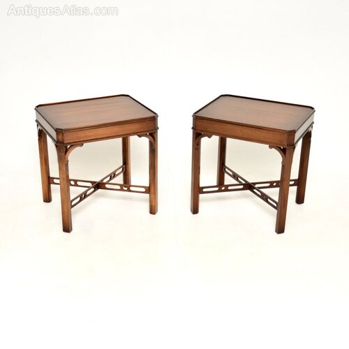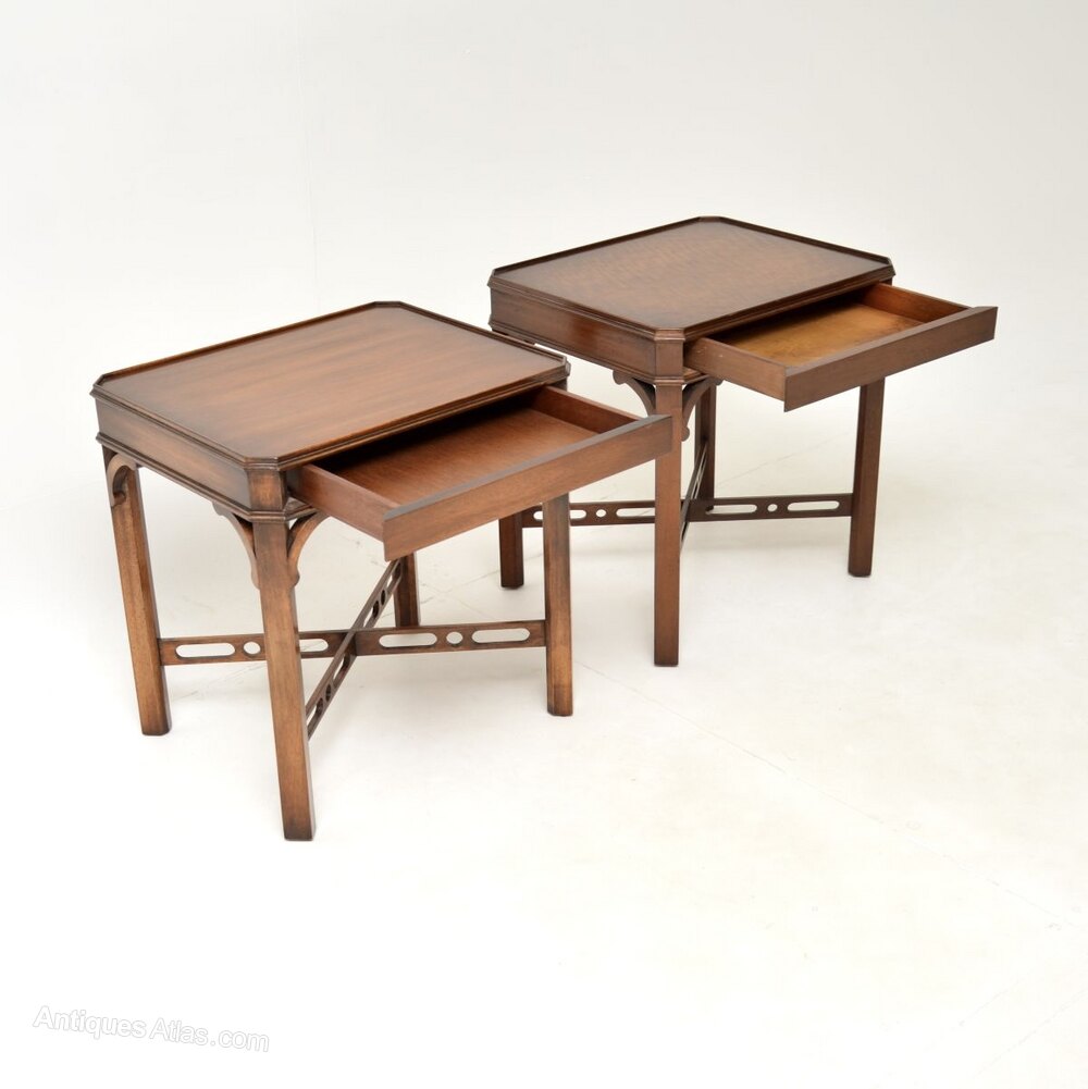 A smart and very useful pair of antique mahogany side tables in the Georgian style. There were made in England, they date from around the 1930’s.They are a great size, the quality is excellent and they are a useful size to be used as lamp tables. The rectangular tops have canted corners and slightly raised edges. There is pierced fretwork under each top corner, the legs have lovely pierced stretchers. Each has a single drawer on the front, and they are nicely finished on all sides, so can be used as free standing items.
