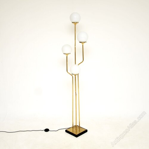 A stunning vintage Italian brass and opaline glass floor lamp by Goffredo Reggiani, dating from the 1970’s.It is of amazing quality and has very stylish design. The tall brass arms support spherical opaline glass orbs, it stands on a black metal base.