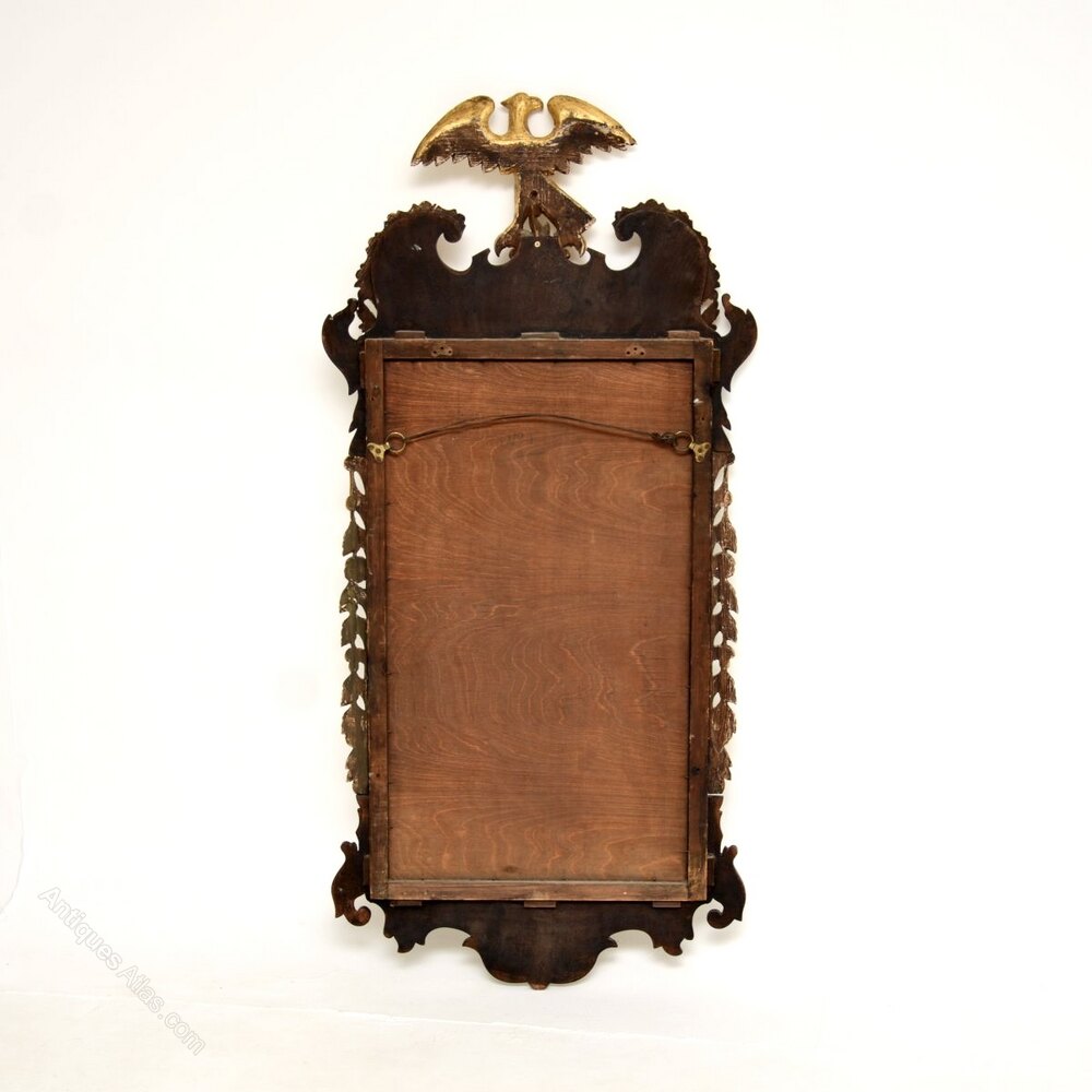 A stunning original large antique Georgian period mahogany parcel gilt mirror. This was made in England, it dates from around the 1800-1820 period.It is beautifully designed and of amazing quality. The frame has fantastic, crisp gilt carving throughout, including a very impressive eagle at the top. It also has plenty of beautifully detailed parcel gilt on the sides.