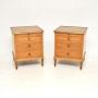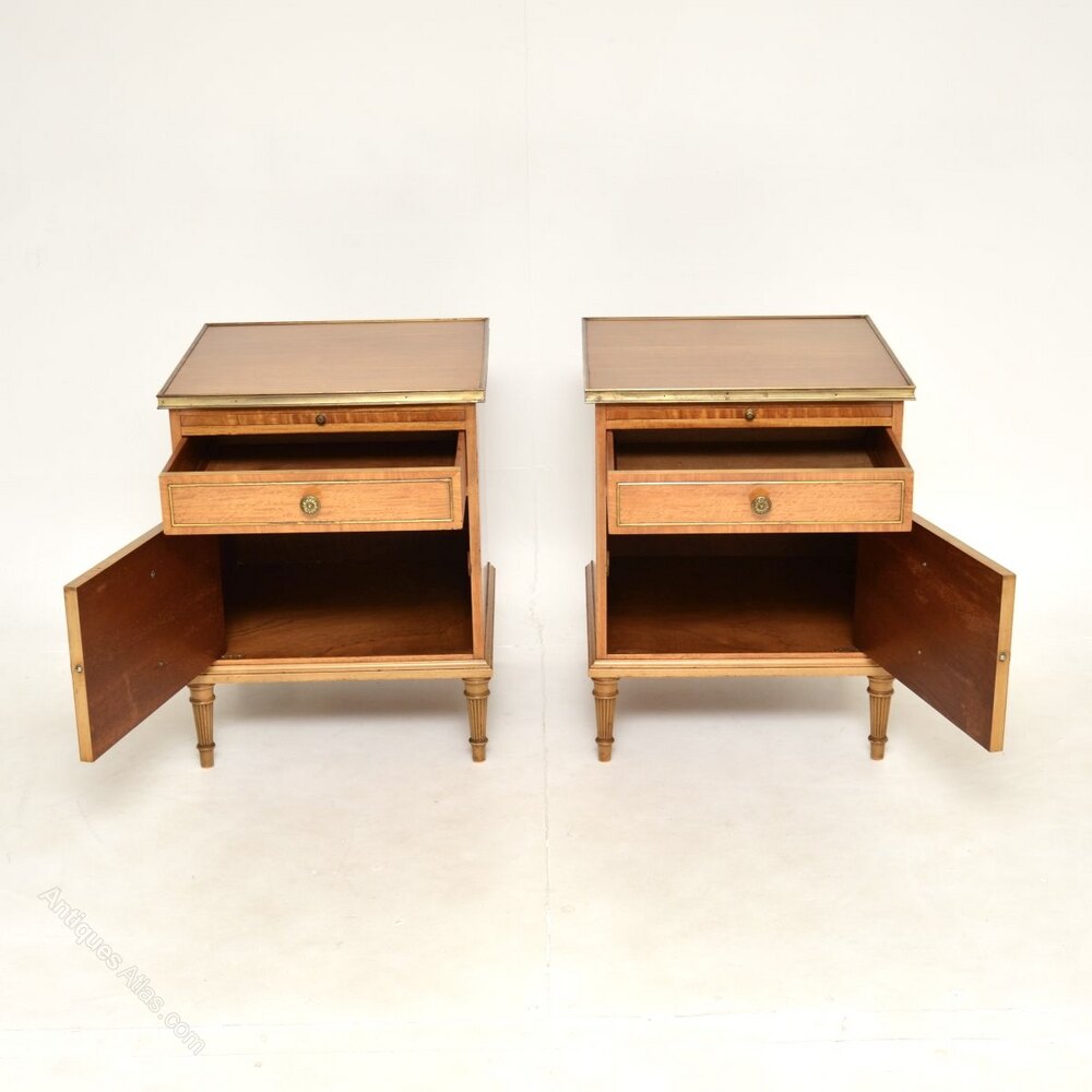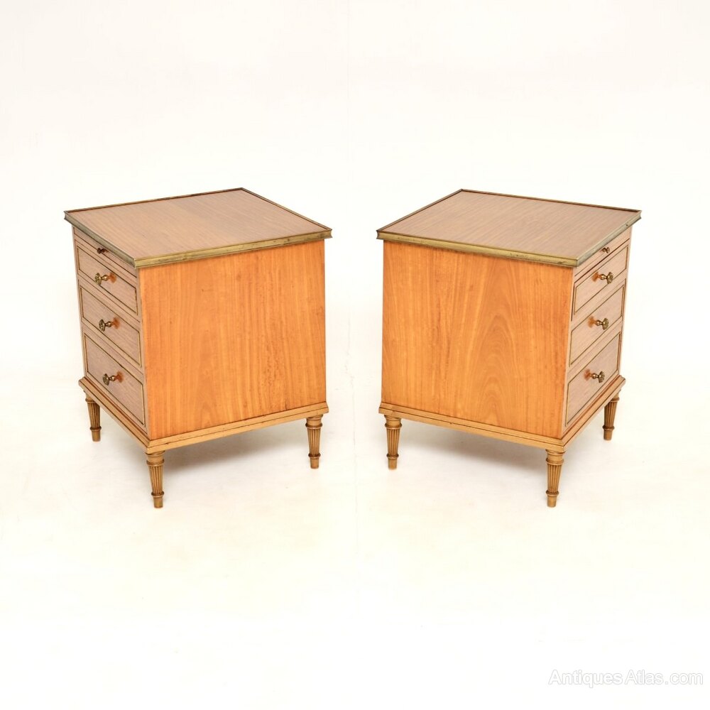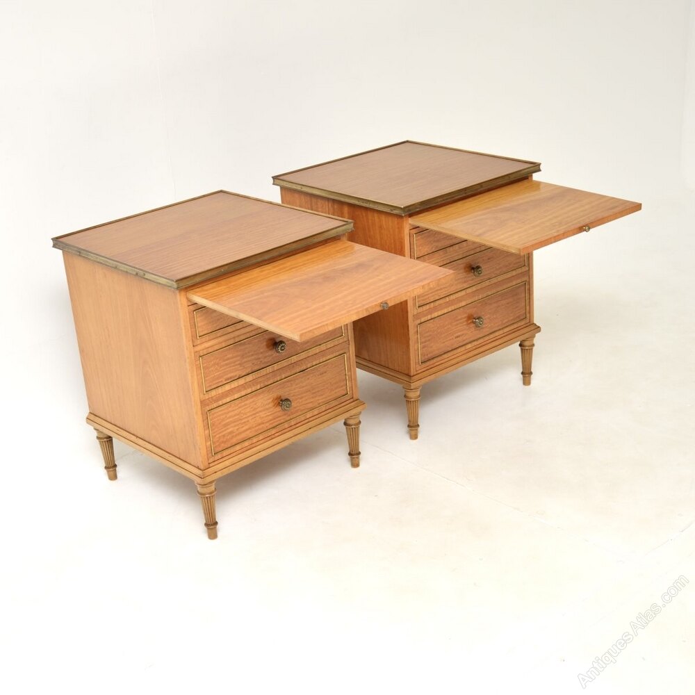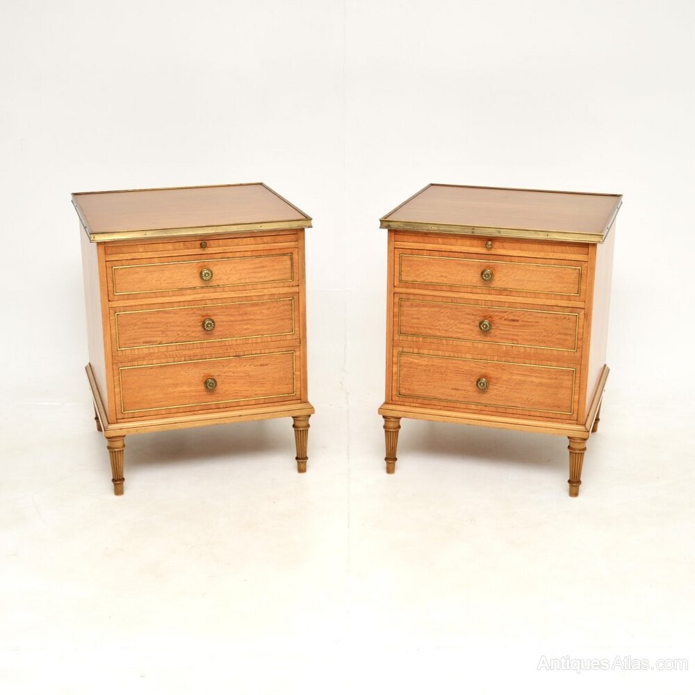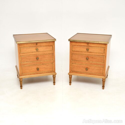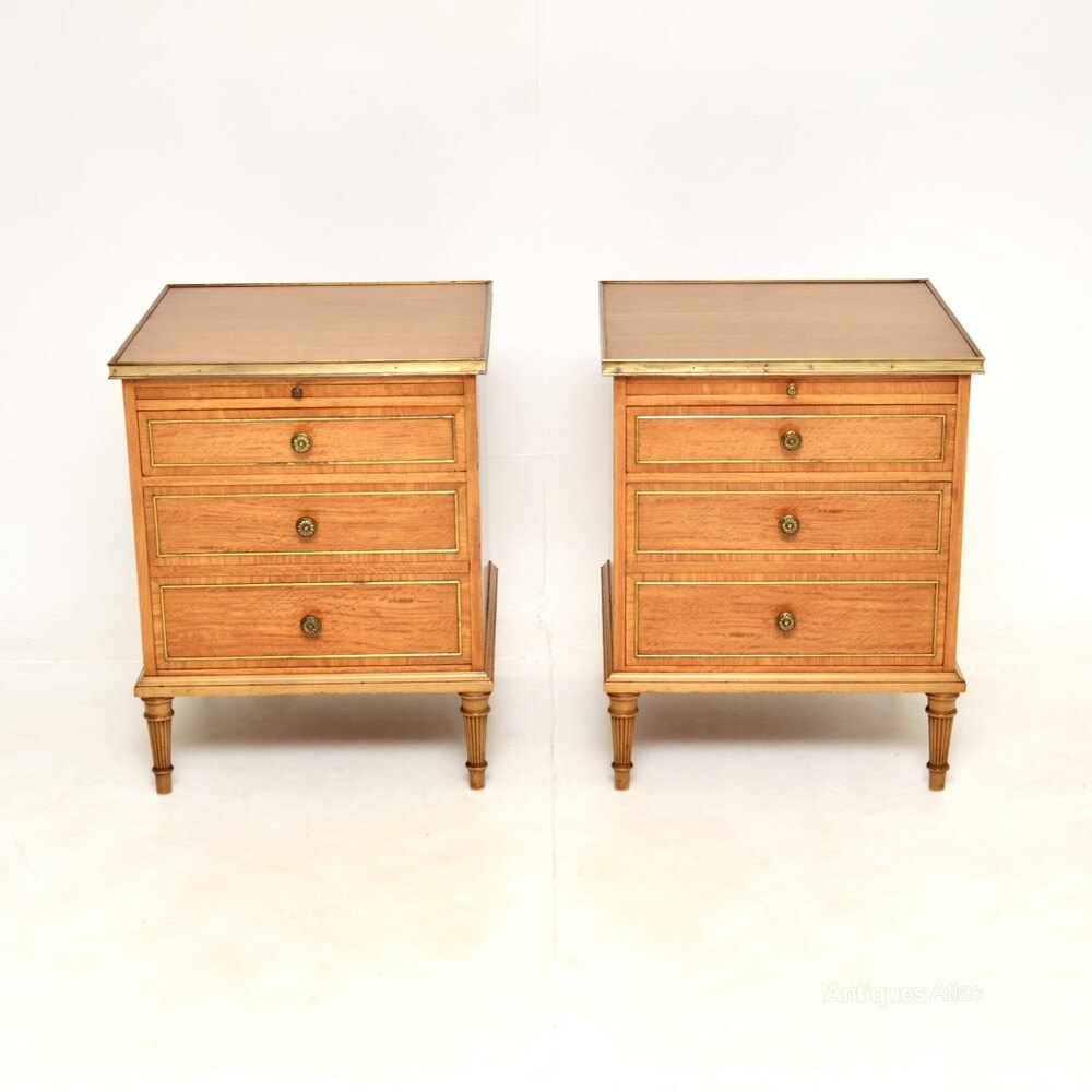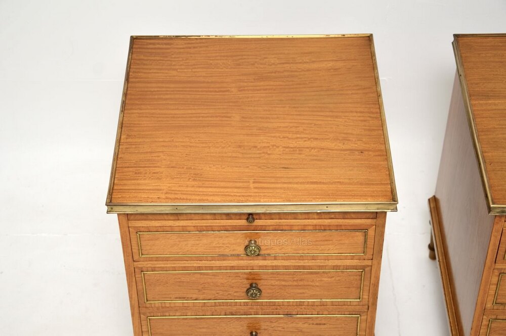 A stunning pair of antique satin wood bedside chests. They were made in France, they date from around the 1900-1920 period.The quality is outstanding, they are a useful and impressive size, with plenty of storage space. The satin wood has a gorgeous colour tone and lovely silky grain patterns. There is a single drawer and the top of each cabinet, the two drawers below are actually dummy drawers which open to reveal cabinet spaces. The drawer fronts and top edges have high quality brass borders, there are also beautifully intricate brass handles. They stand on fluted legs and they have useful pull out tray slide shelves that pull out from beneath the top.
