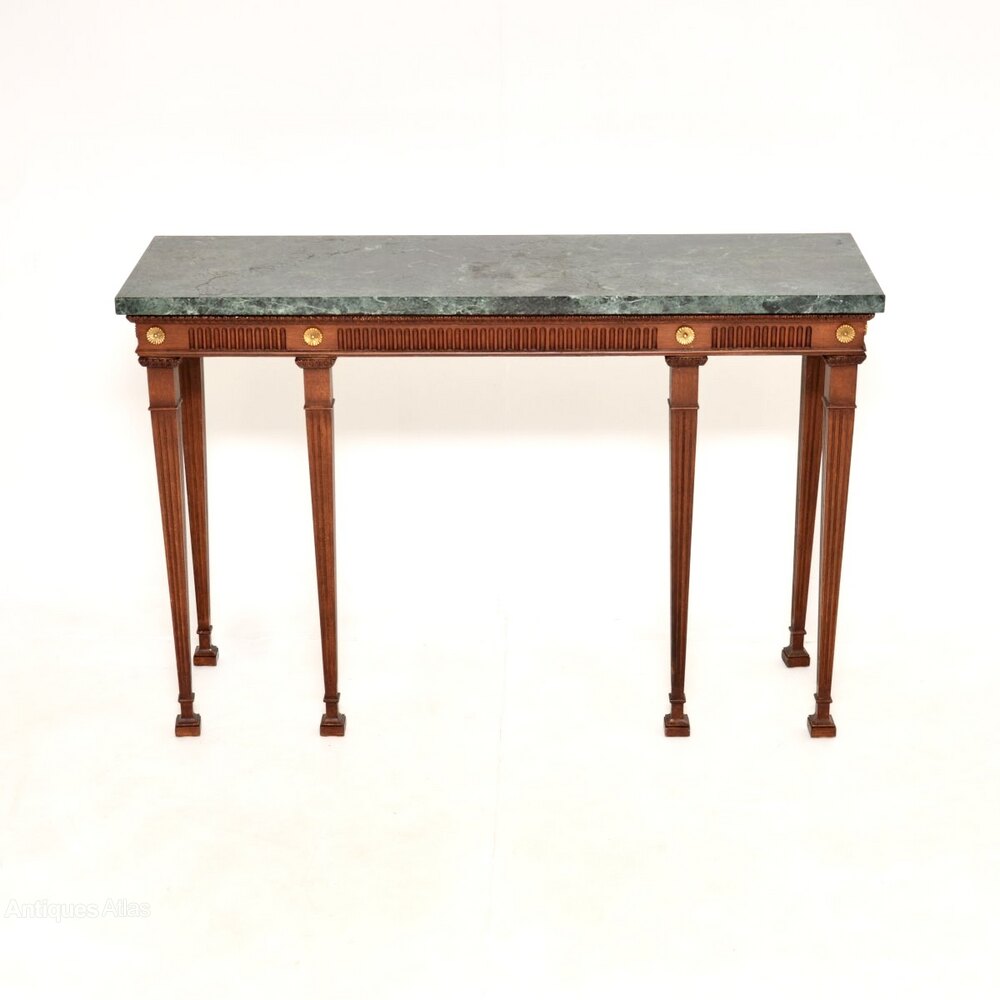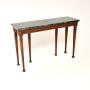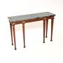 An impressive and extremely well made antique Georgian style marble top console table. This was made in England, it dates from around the 1930’s.It has a stunning design, the solid wood frame has grooved edges and gold rosettes at the top corners, it stands on beautifully grooved and tapered legs. The green marble top is thick and bold, with gorgeous colours and patterns.