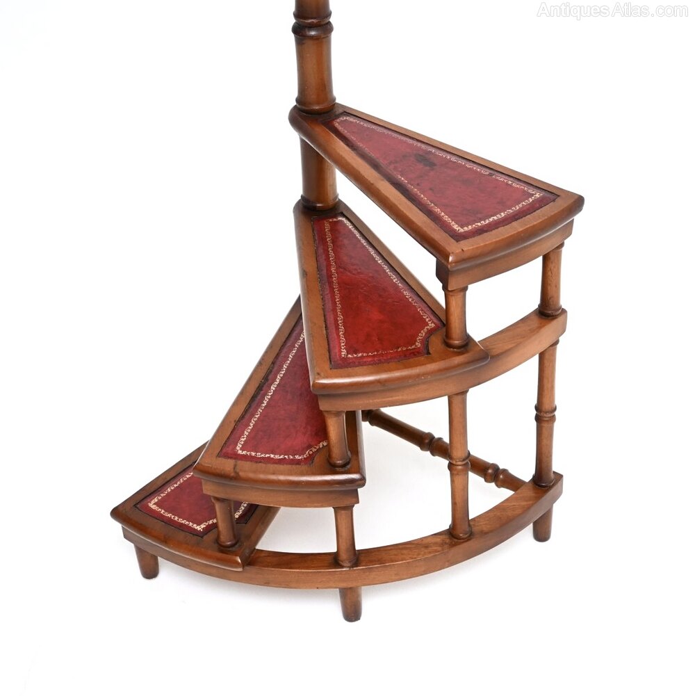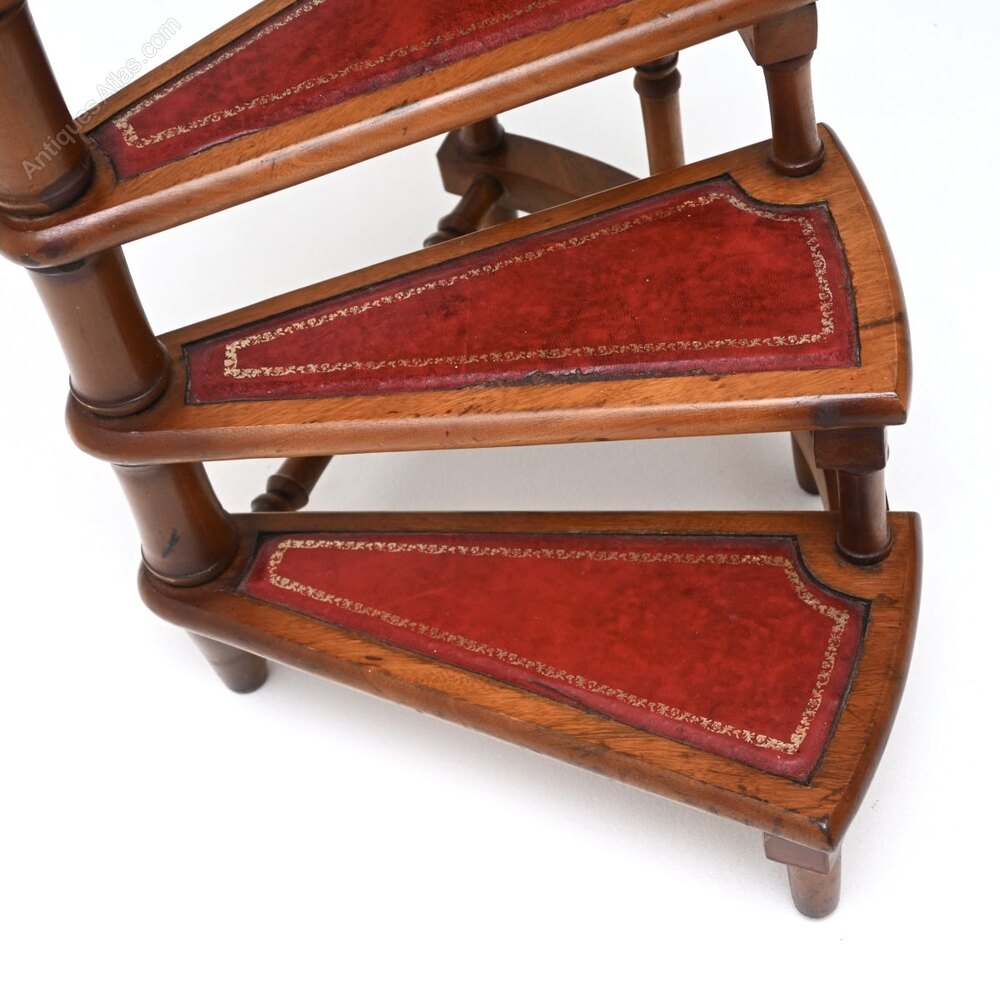 A superb set of antique mahogany and leather library steps in the Georgian style. They were made in England, and date from around the 1930’s period.The quality is fantastic, they are very useful for reaching high shelves, and also make great side tables / decorative items. The mahogany frame is finely constructed, and the steps have inset tooled leather surfaces.