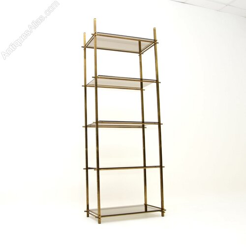 An extremely stylish and very well made vintage French brass etagere display cabinet. This was made in France, it dates from the 1970’s.The quality is outstanding, this is sturdy yet elegant, and is a fantastic size. The frame has a lovely design, and is finished identically front and back, so can be used as a free standing item. The smoked glass shelves are toughened.