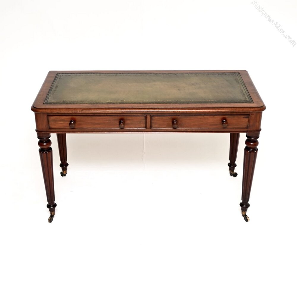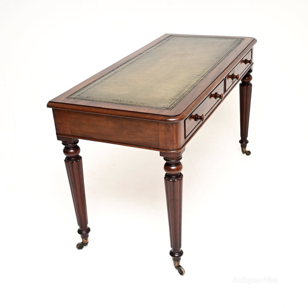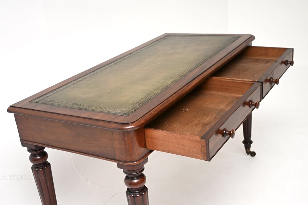 A wonderful antique Victorian mahogany writing table / desk. This was made in England, it dates from around the 1860-1880 period.This is of wonderful quality and is a very useful size, with lovely proportions. It stands on beautifully turned and fluted baluster legs, terminating in brass casters. There are two drawers with nicely turned handles and fine, hand cut dovetailed joints. There is an inset leather top with gold tooled edges, the leather has a beautiful colour which compliments the mahogany nicely.