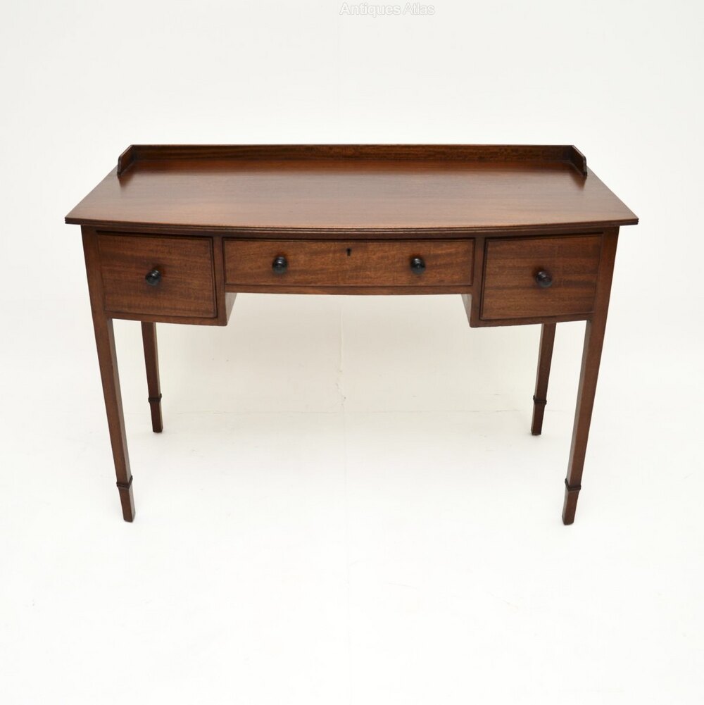 A smart and very useful antique Edwardian mahogany desk / writing table. This was made in England, it dates from around the 1900-1920 period.The quality is superb, this has a lovely design with a slightly bow shaped front and a raised gallery at the back. There are three generous drawers with nicely turned handles and fine, hand cut dovetailed joints. The drawers contain a makers label and also have patent number tags, so this is a patented design. It stands on nicely tapered legs terminating in spade feet. The mahogany has a gorgeous colour tone and patina.