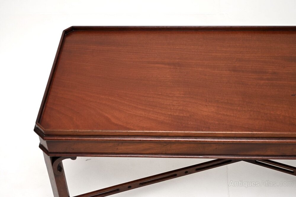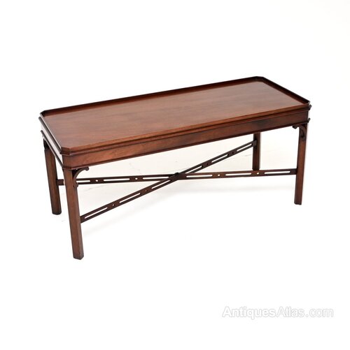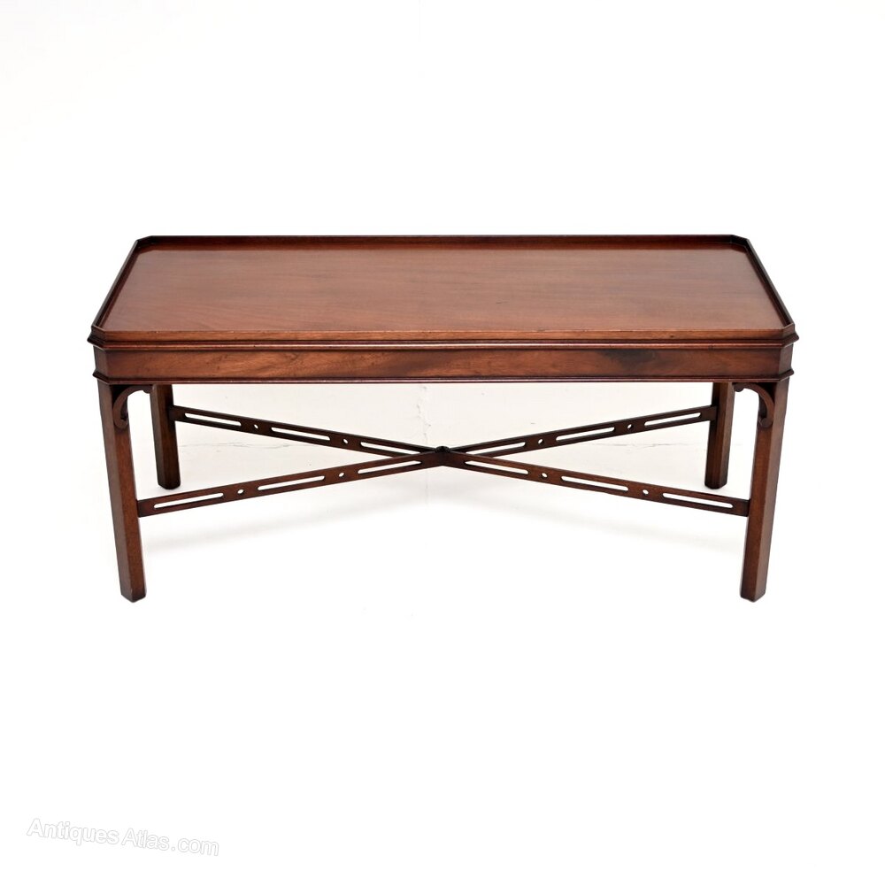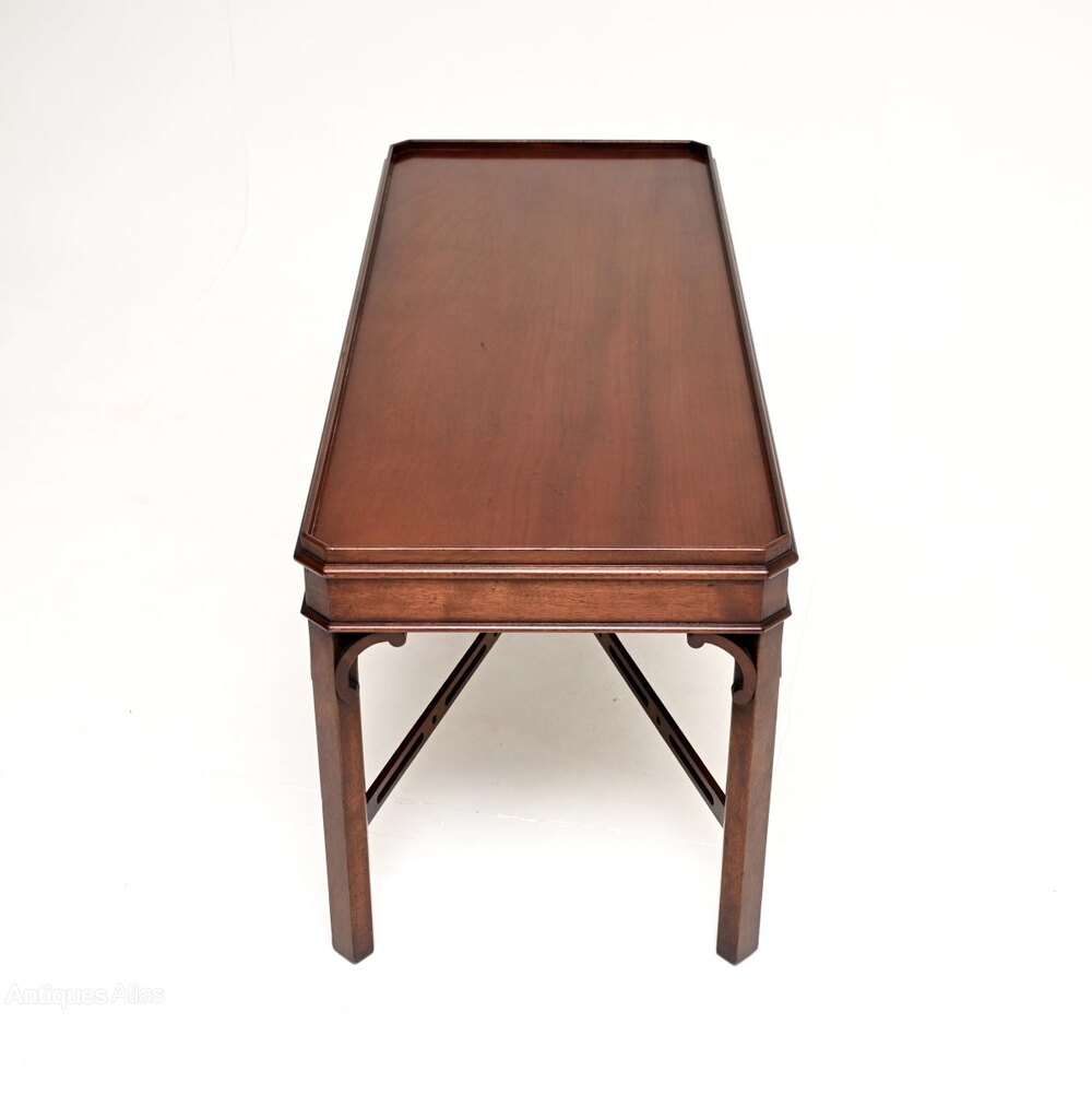 A smart and beautifully made antique Georgian style mahogany coffee table. This was made in England, it dates from around the 1950’s.The quality is superb, this is a great looking item and it is a very useful size. The top has a shaped raised edge and has lovely pierced fretwork under the corners. It stands on a nicely detailed stretchered base that connects the legs and gives extra stability. The mahogany has a gorgeous colour tone and lovely grain patterns.