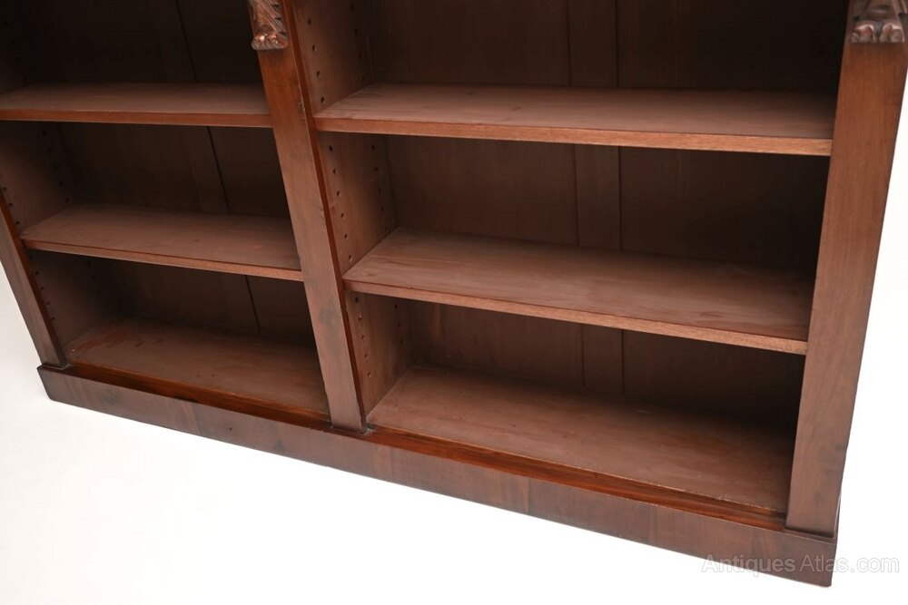 A large and impressive antique Victorian mahogany open bookcase. This was made in England, it originally dates from around the 1860-1880 period.It was in very bad shape when we obtained it, it has been partially re-constructed by our restoration team. The top and the back section have been completely rebuilt and replaced, most of the original carcass and the carved corbels are original.