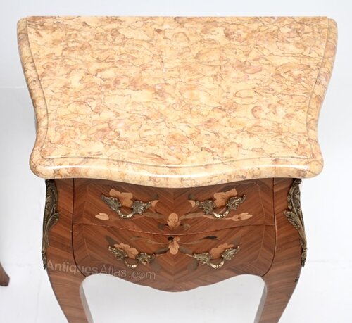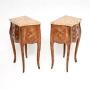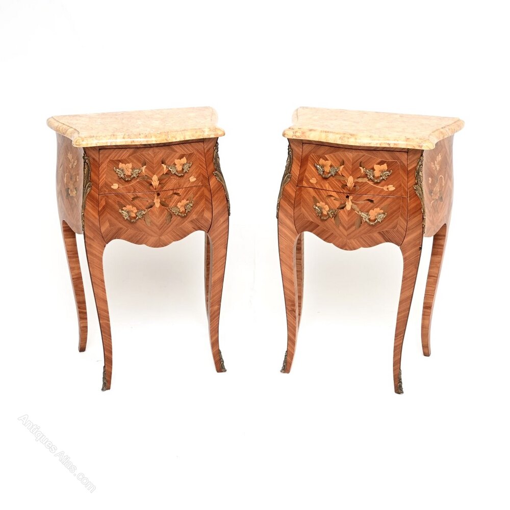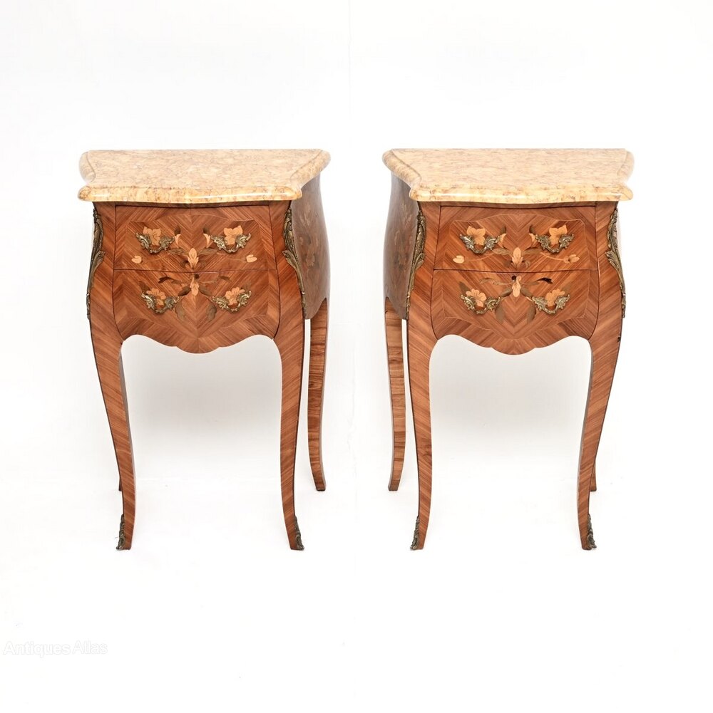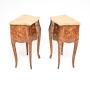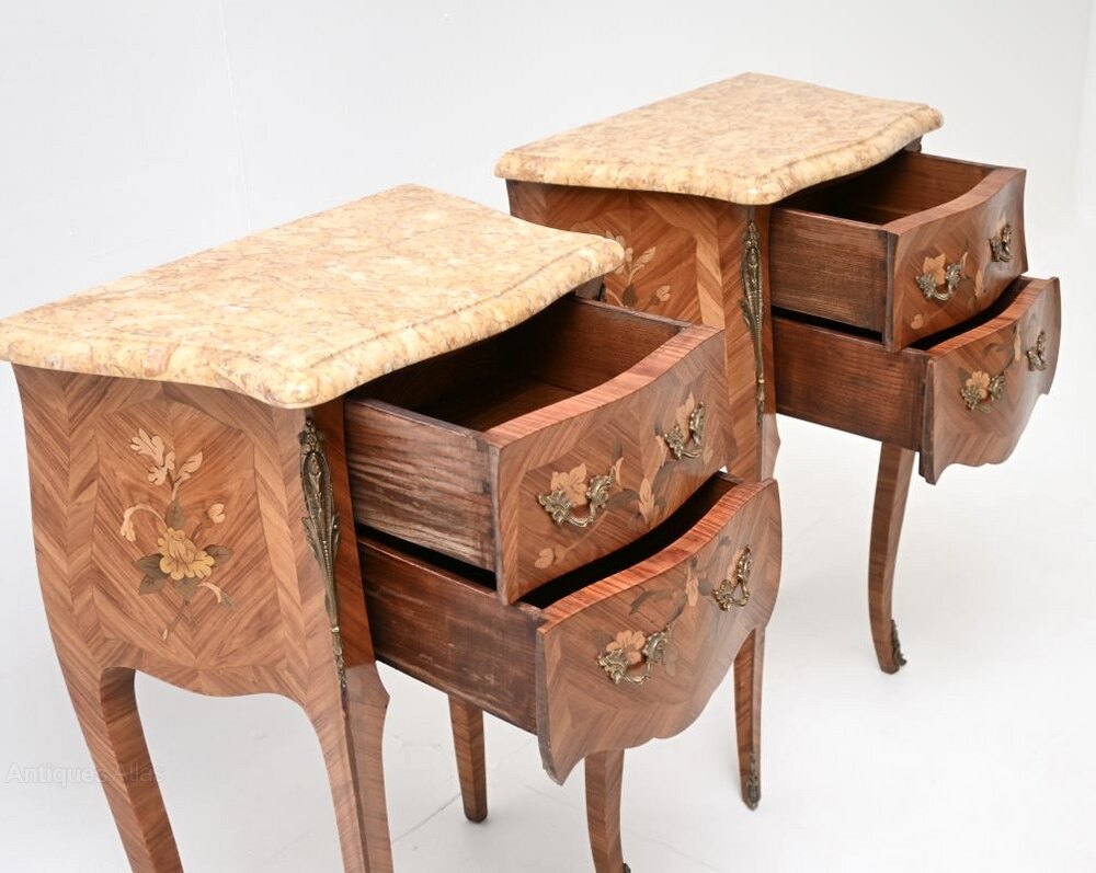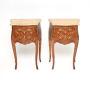 A stunning pair of antique French inlaid marquetry marble top bedside chests. They were made in France and date from around the 1900-1920 period.The quality is fantastic, they have an elegant yet sturdy design. The wood is predominantly king wood, with inlaid marquetry of various other woods. There are high quality ormolu mounts and handles, each has a loose serpentine fronted marble top with gorgeous colouring.