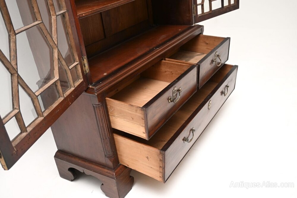 A well proportioned and very beautiful antique Georgian period mahogany bookcase. This was made in England, it dates from around the 1800-1820 period.It has an interesting and useful design, and is of superb quality. This is of fairly small proportions, the two doors have amazing astral glazing, and open to reveal four adjustable shelves. The base has fluted columns on the front corners, with three generous drawers that have brass handles and escutcheons. This sits on nicely shaped bracket feet and has a beautifully detailed cornice.