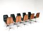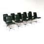 The condition is excellent for their age, we have had the rosewood cleaned and re-oiled, the steel bases have cleaned up nicely. The original green vinyl is in great condition, it is clean and mostly free from any real damage or marks. There is just one small area of nicks on the edge of one seat, barely noticeable but seen in the images. They are all sturdy and swivel smoothly, the seats are all very well padded and supportive. The black plastic feet caps are all present, one or two have a little bit chipped off the edges, one chair has a tiny chip to the veneer on the upper back edge, all seen in the images.