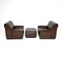 A superb pair of vintage leather armchairs and stool by De Sede, made in Switzerland and dating from around the 1960’s.The quality is outstanding, only the finest quality materials were used when constructing De Sede furniture. These chairs are extremely well built and are very heavy. They are upholstered in a very thick and supple hide, which has a beautiful colour tone and patina. They have very generous proportions and are very comfortable. Each chair has built in storage pouches on each side, perfect for storing books / magazines, remote controls etc.
