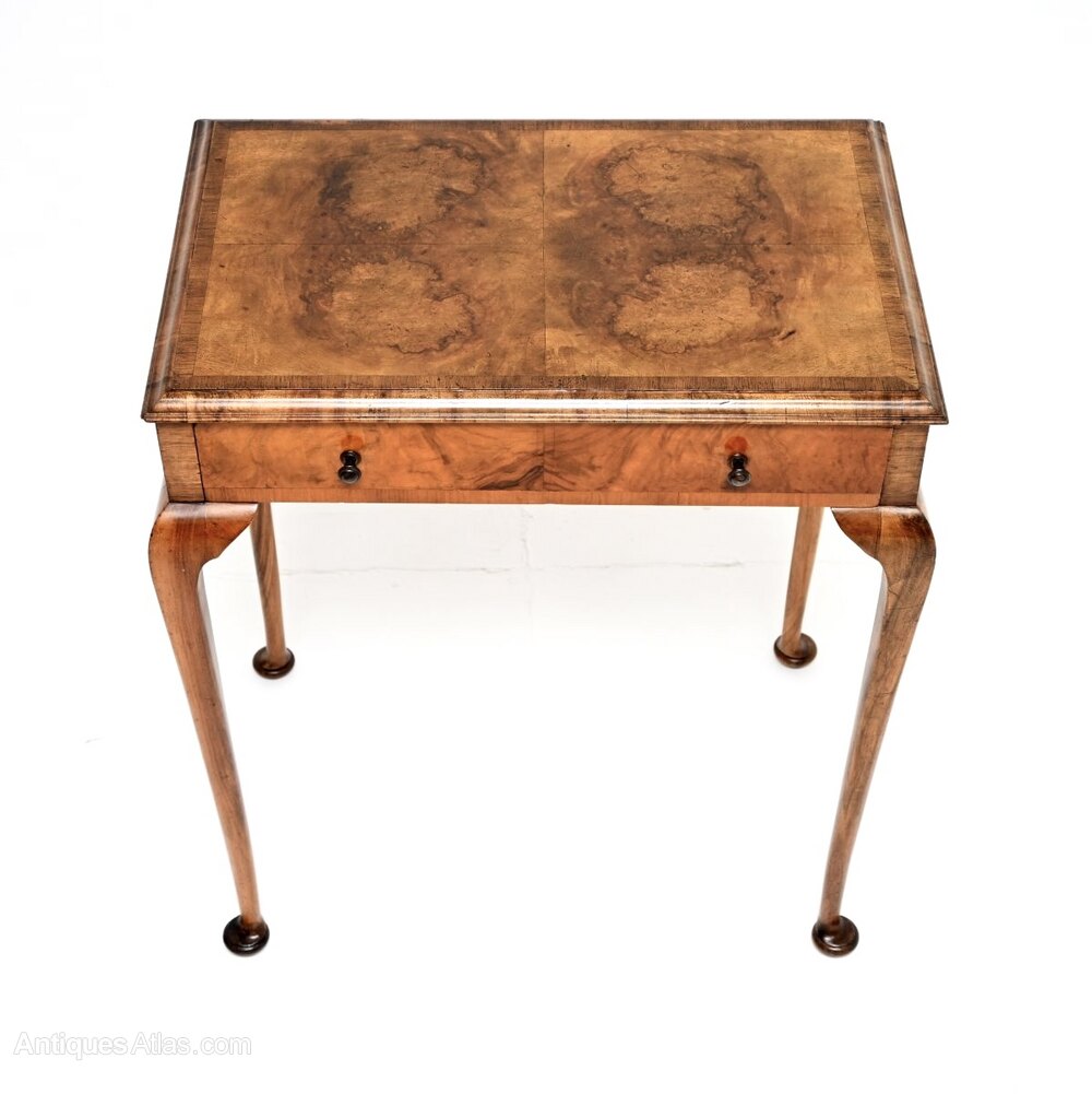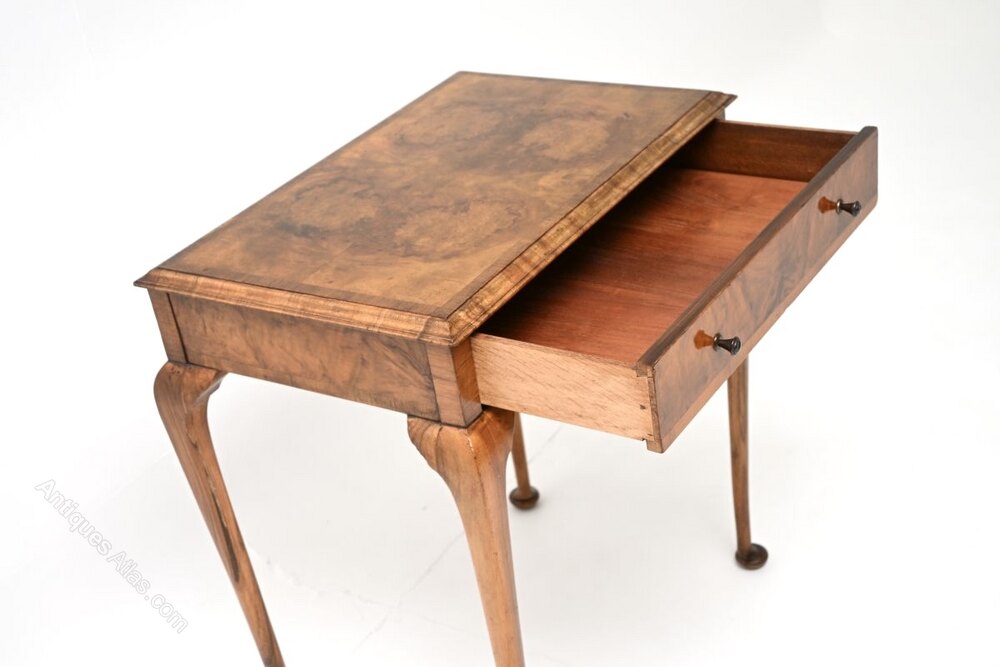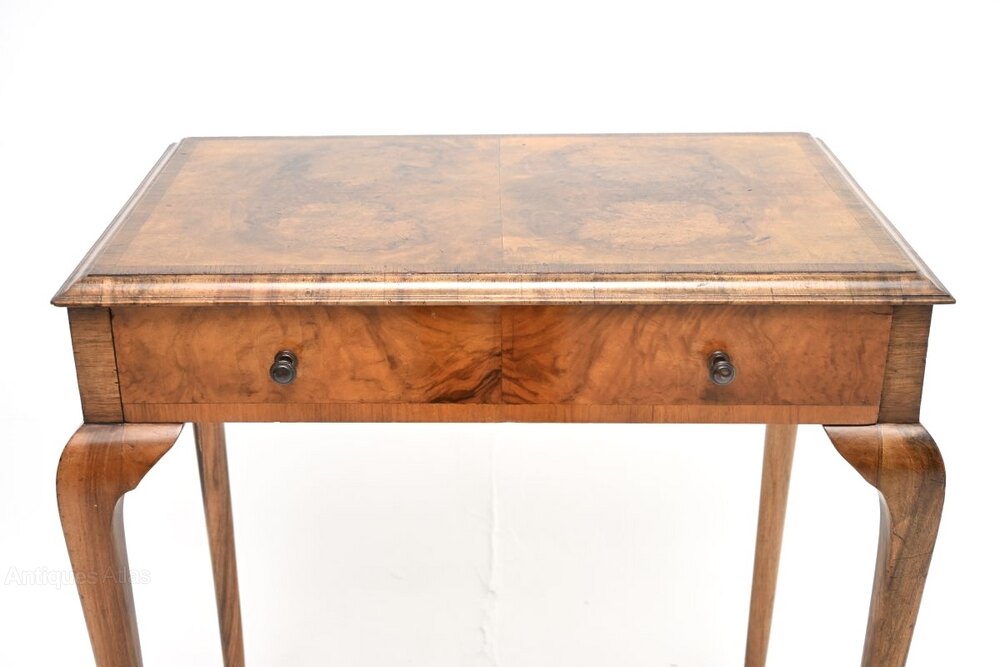 A smart and useful antique burr walnut side table. This was made in England, it dates from the 1920’s.It is of lovely quality and is a very useful size. The burr walnut grain patterns are stunning, this has a cross banded top and is also nicely finished on the back with burr walnut, so can be used as a free standing item.
