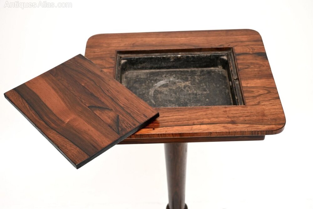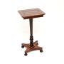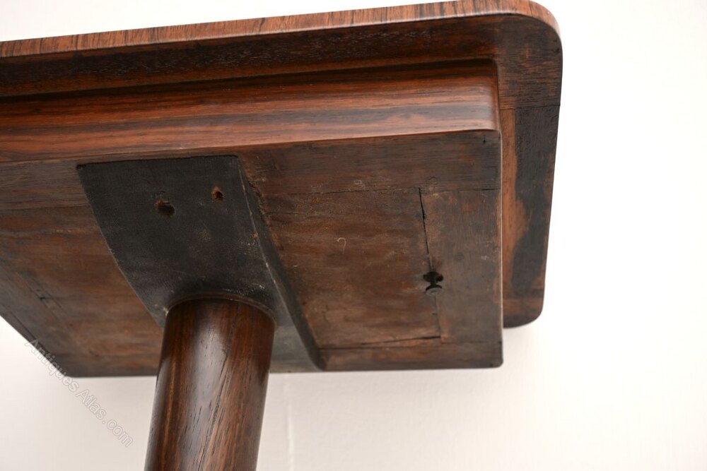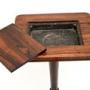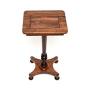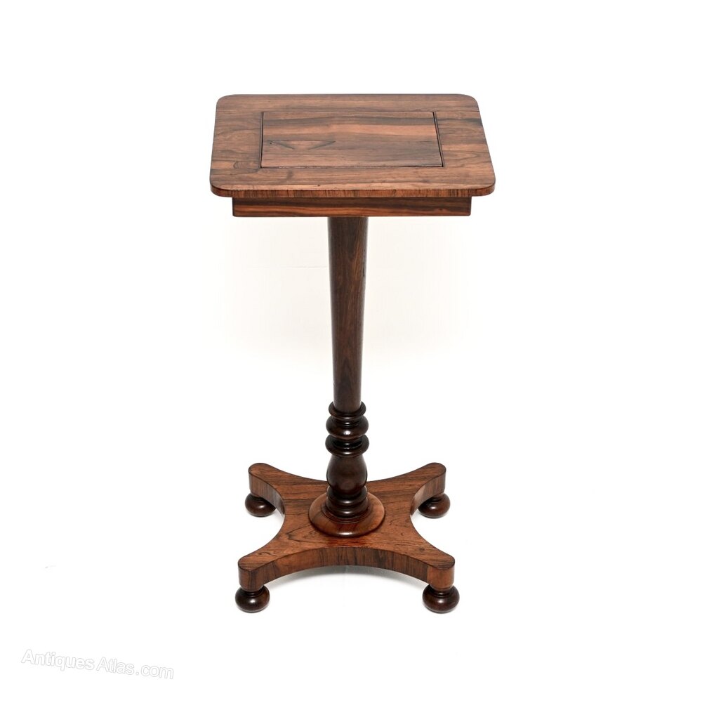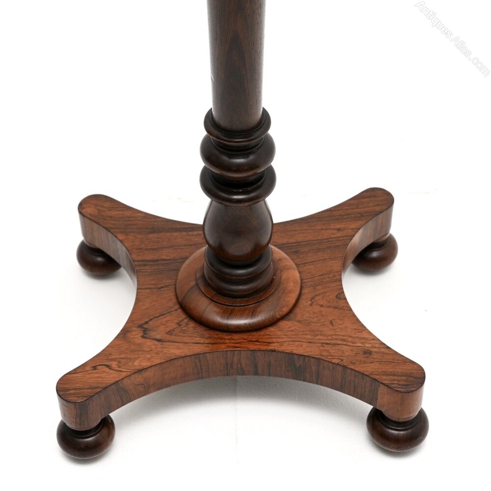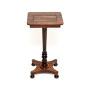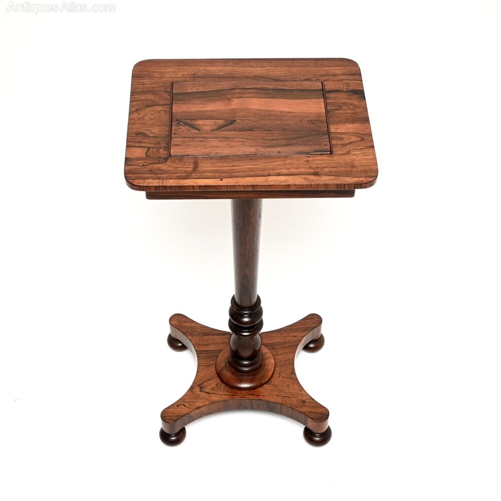 A gorgeous antique William IV rosewood side table. This was made in England, it dates from the 1830-1840 period.It is of fine quality, with a slender and elegant design. The top has an unusual insert that can pop off and lift out to reveal some inner storage space. There is a small brass pin under the top that is pushed to release the top. It stands on a slender tapered column base terminating in a platform base and bun feet.