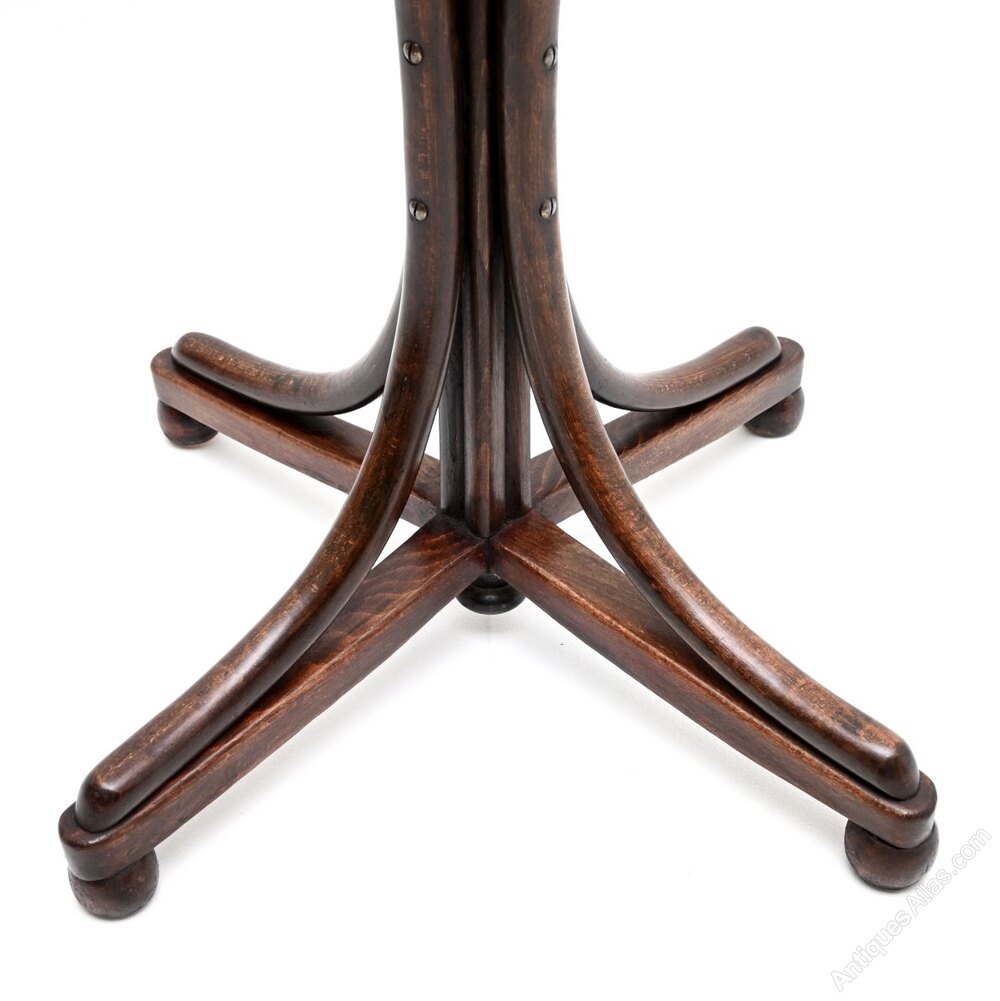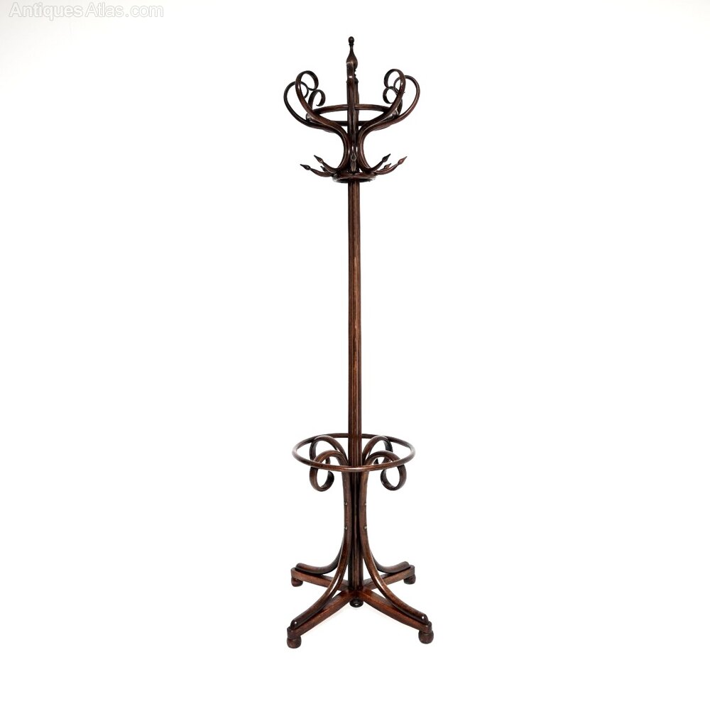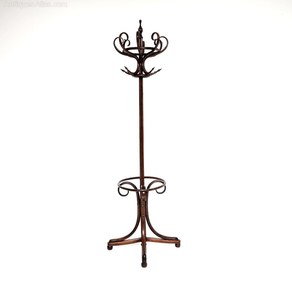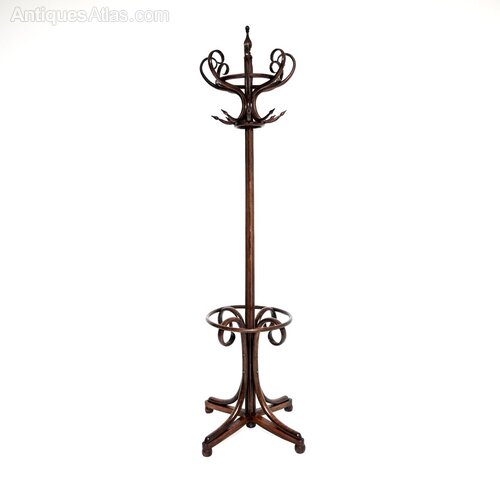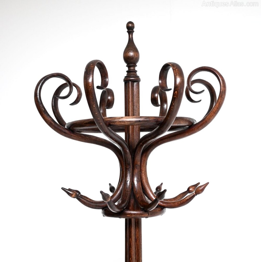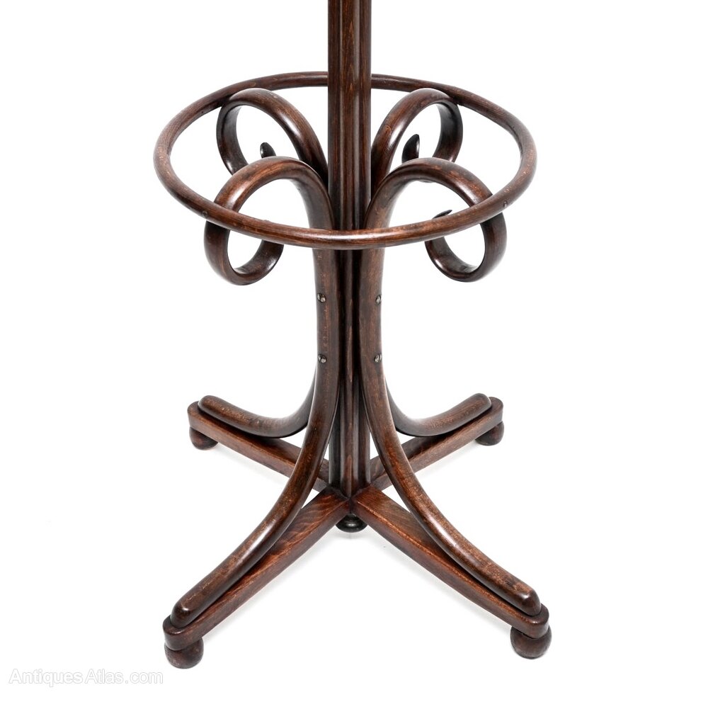 A wonderful original antique Victorian bentwood hatstand / coat rack. This was made in central Europe in Austria, most likely by Thonet. It dates from around the 1880-1900 period.It is a fantastic model, about as good as antique hatstands come. It has generous proportions with a very wide and beautifully curvaceous base. It has eight beautifully curved supports on the top for coats and hats, the base is designed to support umbrellas and walking sticks.