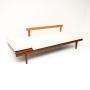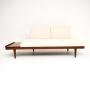 A stylish and very well made vintage Scandinavian sofa / day bed by Ingmar Relling. This was made in Norway by Ekornes Svane, it dates from the 1960’s.The frame is mostly made from afromosia wood which has a lovely colour tone, the back rest is a lighter coloured birch that contrasts nicely. It stands on beautifully tapered legs and has a built in side table which has a teak top. The loose back rest cushions can be placed on the table to be used as a head rest, the seat also lifts up to reveal built in storage space for blankets.
