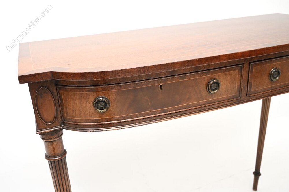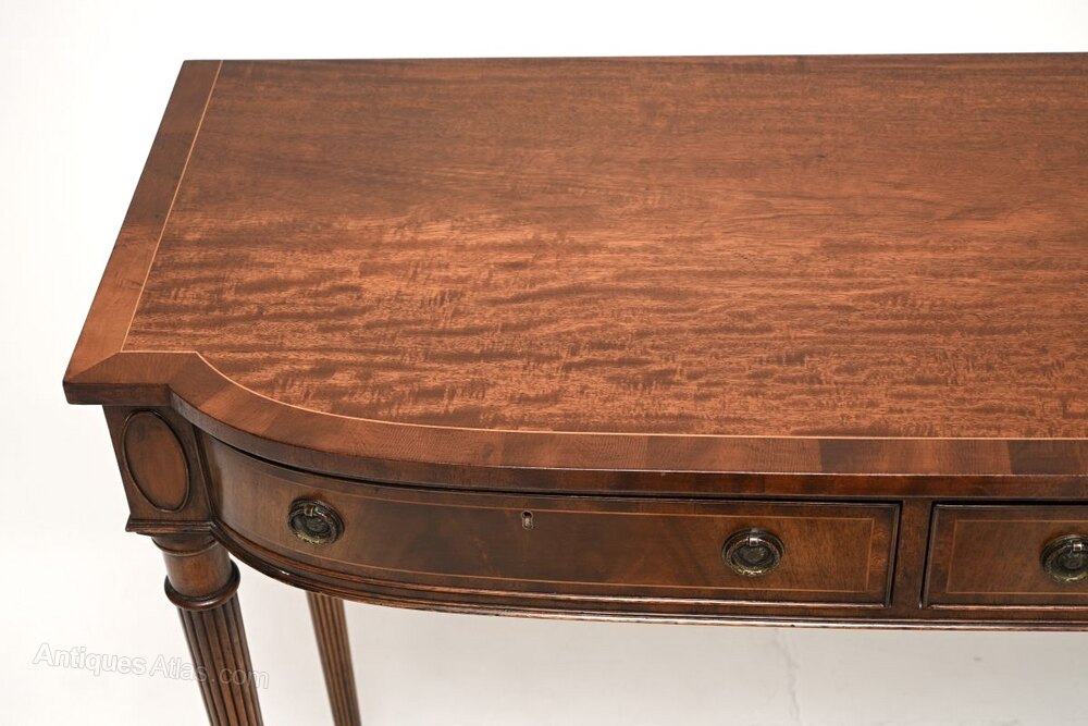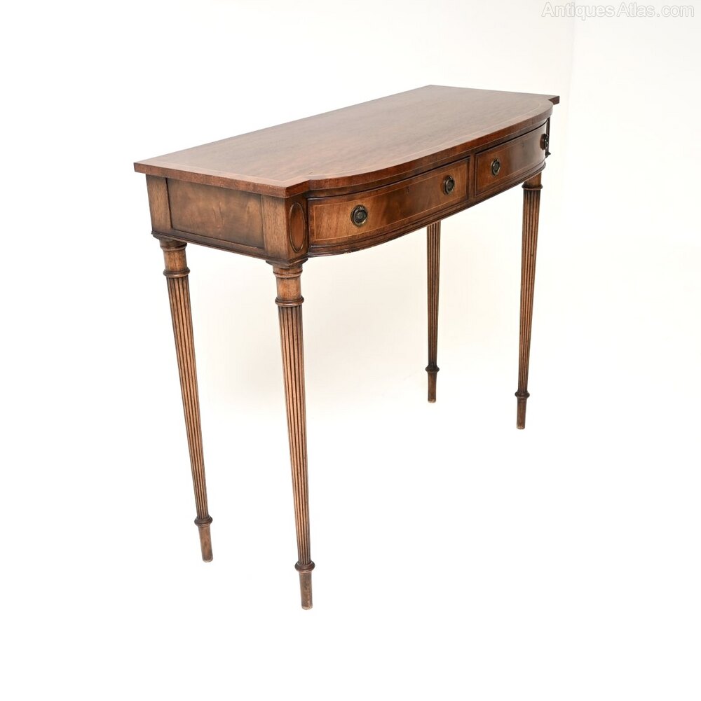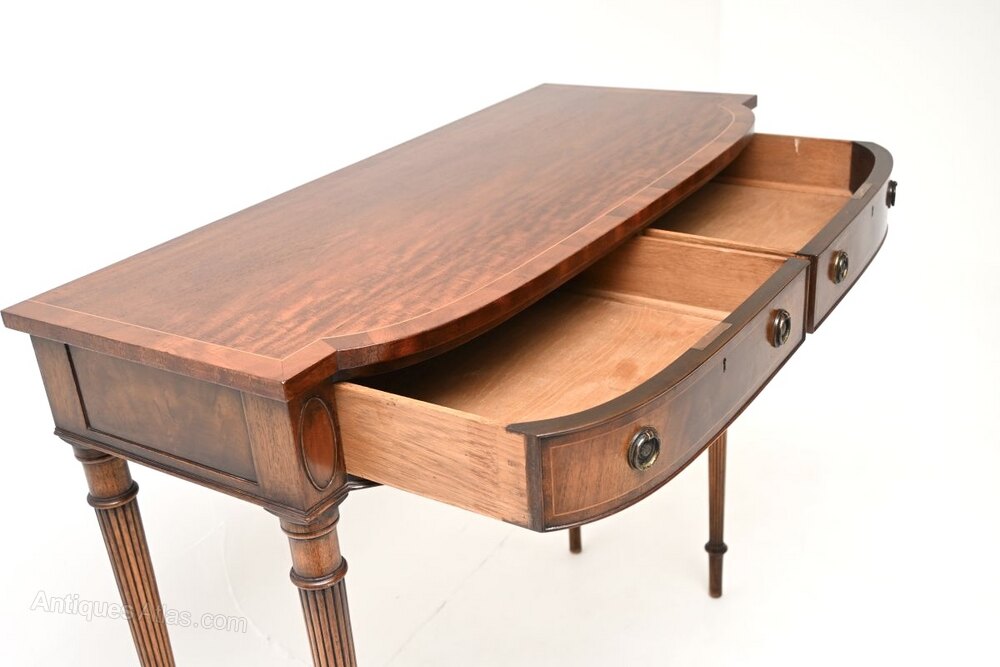 An outstanding antique Georgian style inlaid mahogany console table, made in England and dating from around the 1930’s.This is of beautiful quality and is extremely well made. It is a very impressive and useful size, with useful storage space in the two drawers. The drawers are solid oak lined with fine, hand cut dovetailed joints. This has a lovely bow shape to the front, with fine satin wood inlays, it stands on elegant yet sturdy tapered and fluted legs.