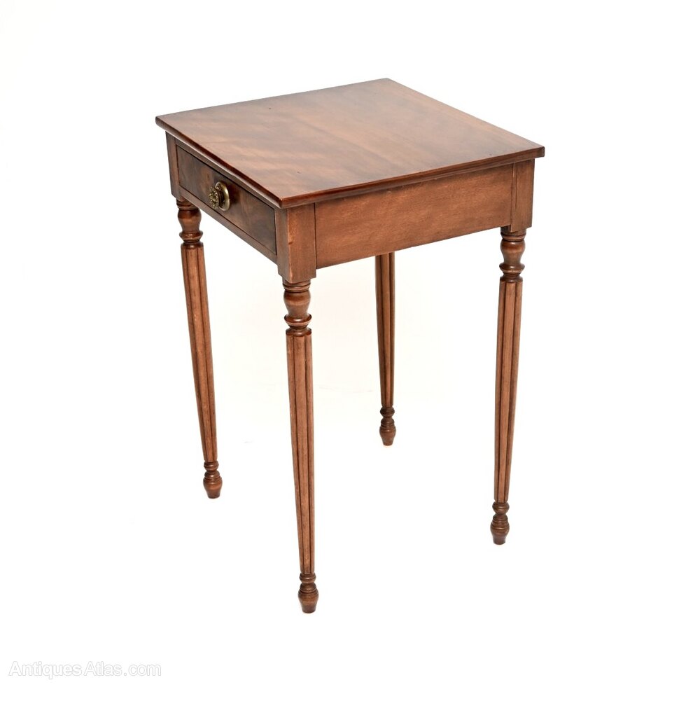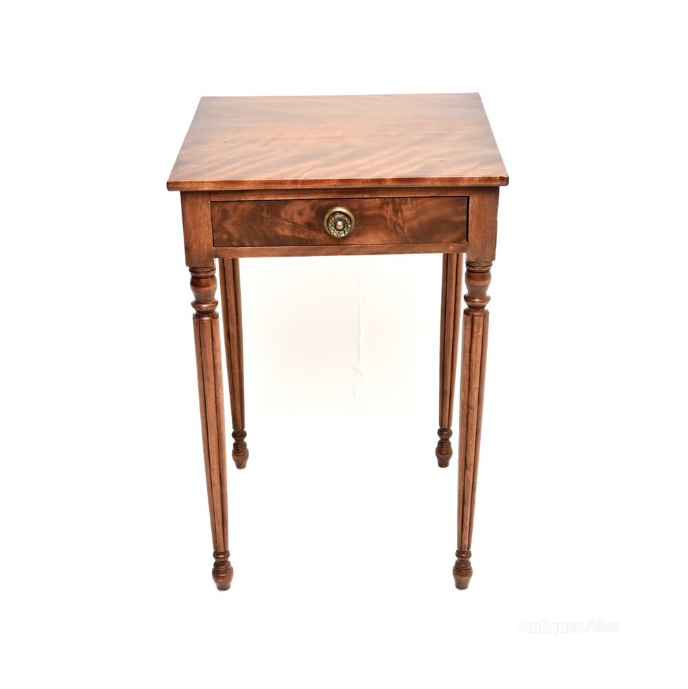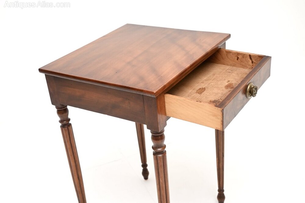 A wonderful antique Georgian period walnut side table. This was made in England, it dates from around 1800-1820 period.It is a lovely size and is full of character. The walnut has a gorgeous colour tone and a lovely patina, with some small surface marks here and there beneath the polish. There is a single drawer with a brass handle, it stands on beautifully turned and fluted legs. This has a nicely polished back, so it can be used as a free standing item.