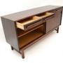 The interior is nicely fitted out with adjustable shelves in the lower cabinet sections. The drawers run smoothly, the two on the right are felt lined and also have removable felt lined removable trays inside. The Danish quality control badge is seen inside the lower right cabinet. The base can be removed for ease of transport, the back is also beautifully finished in rosewood, so this can be used as a free standing item.