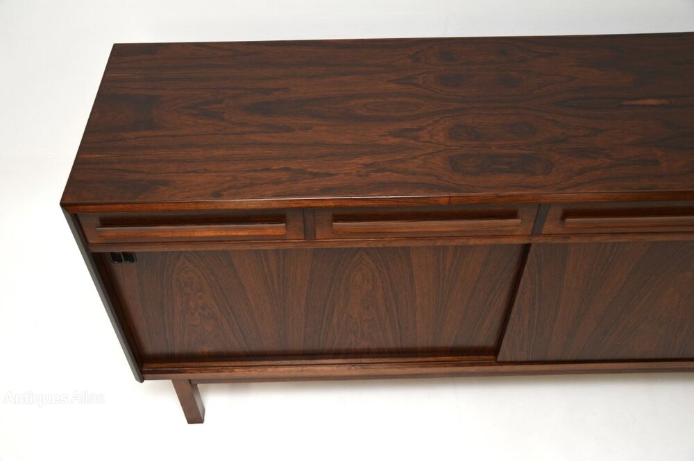 An exceptional Danish vintage rosewood sideboard by Bordum and Nielsen. This was made in Denmark and it dates from the 1960’s.The quality is phenomenal, this incredibly well crafted. The rosewood grain patterns and colour tones are gorgeous, it has lovely sculpted solid rosewood handles on the drawers, and lovely recessed handles on the sliding doors.
