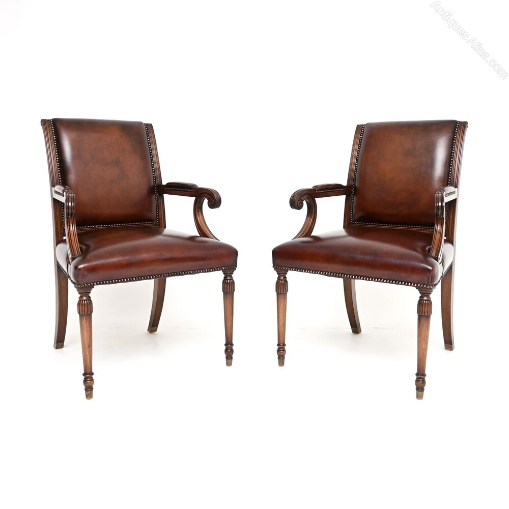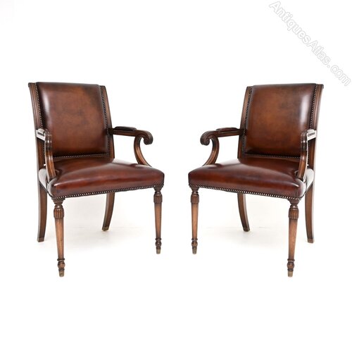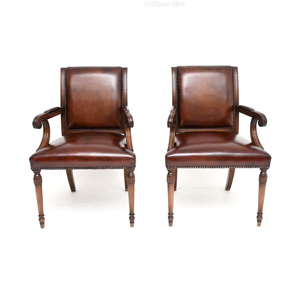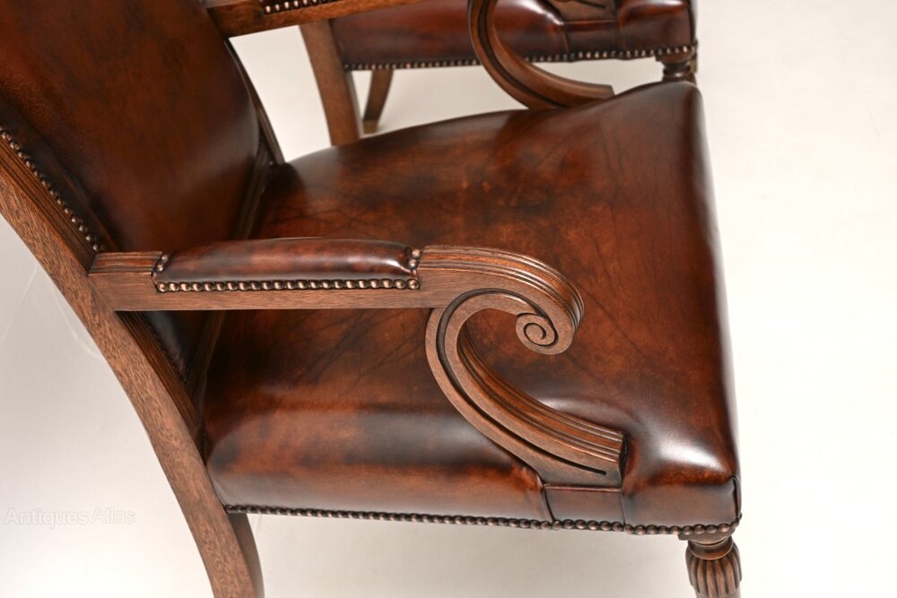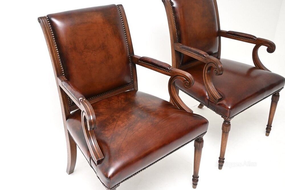 A smart and extremely well made pair of antique Georgian style leather and mahogany armchairs. They were made in England, they date from around the 1950’s.They are of superb quality, with a lovely design. They are very comfortable and supportive, the solid mahogany frames are elegant yet sturdy. They stand on beautifully turned legs and have lovely scrolled armrests.