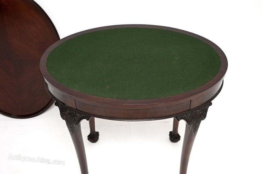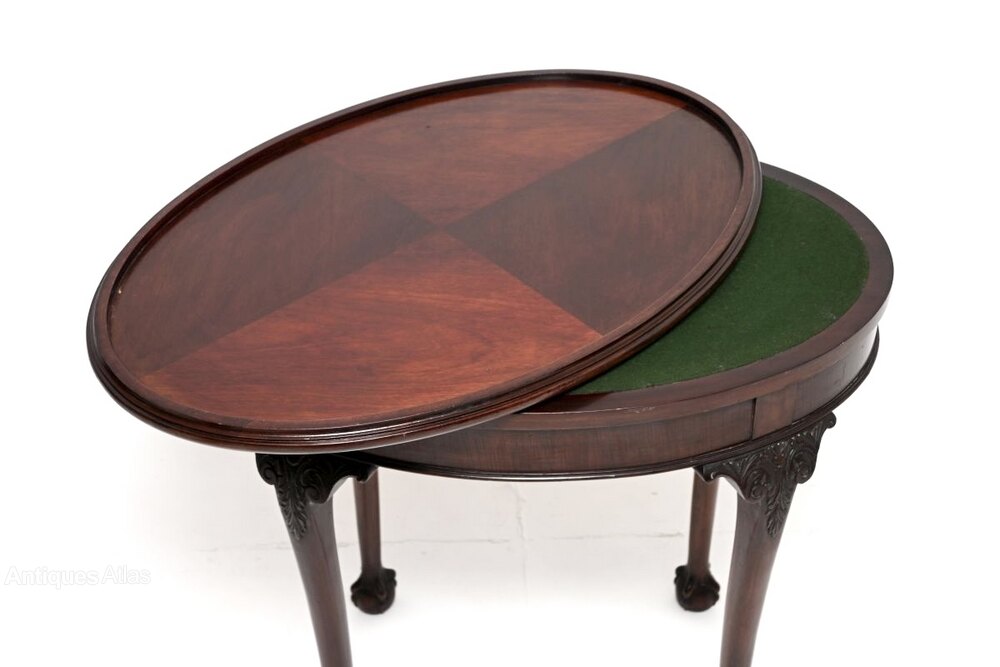 A lovely antique Edwardian mahogany & satinwood occasional card table, made in England and dating from around 1900-1910.It is of outstanding quality and is a useful size to be used as an occasional table around the home. It has an interesting feature whereby the oval top lifts off to reveal a green baize playing surface. The top is nicely finished on both sides and can double up as a serving tray.