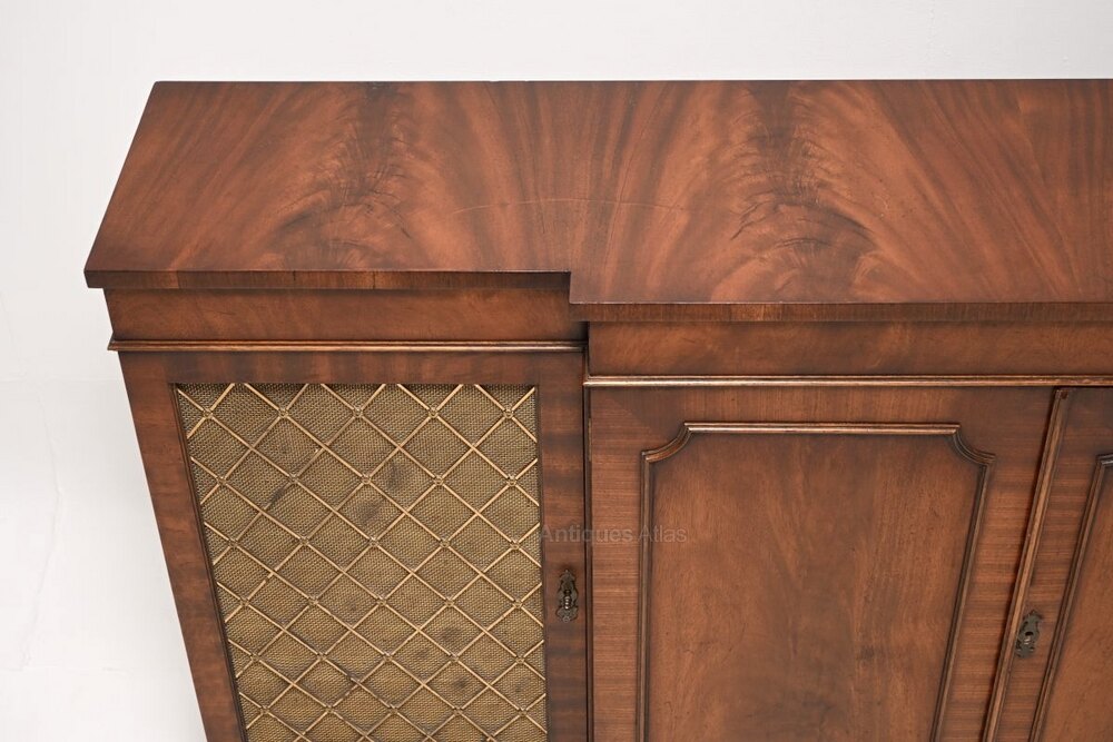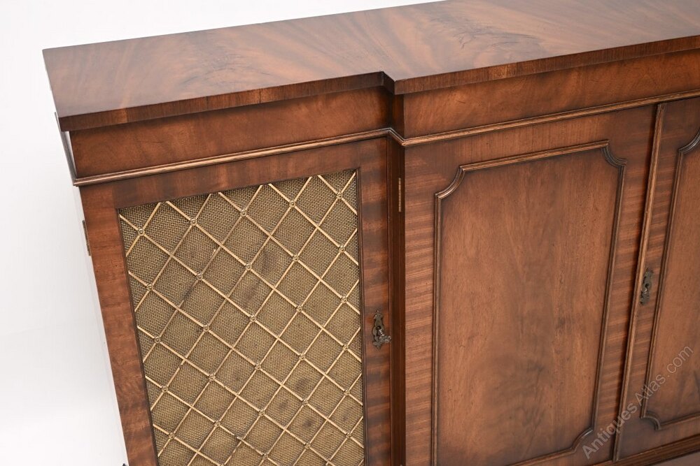 An impressive and very well made antique mahogany grill front sideboard in the classic Georgian style. This was made in England, it dates from around the 1930’s.The quality is outstanding, this is beautifully designed and is a very useful piece of furniture. There is lots of storage space inside, this is low and wide yet not too deep and imposing. There are two fixed shelves in the central cabinet, the two side cabinets also have adjustable shelves. There are brass grills on the outer doors sitting on brass mesh panels, the panels on the central doors have stunning flame mahogany grain patterns.