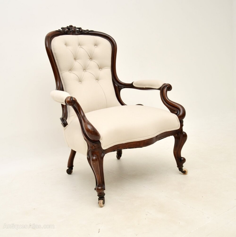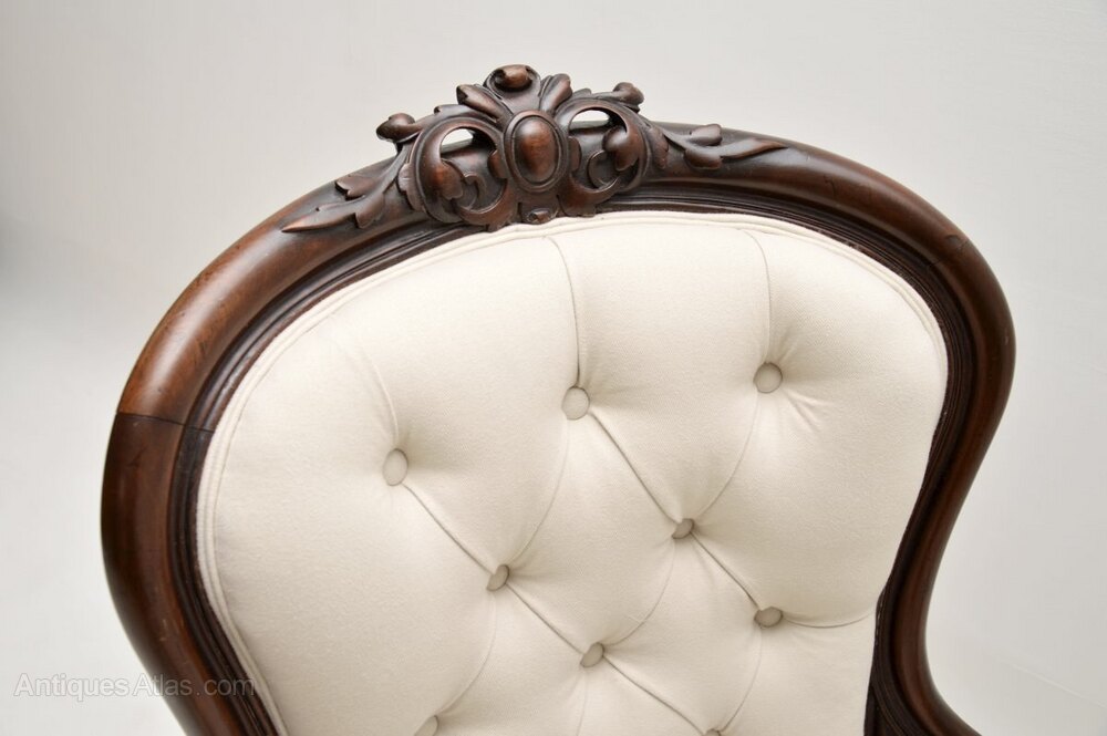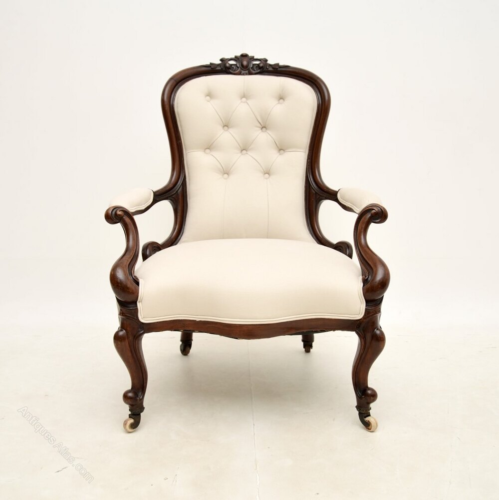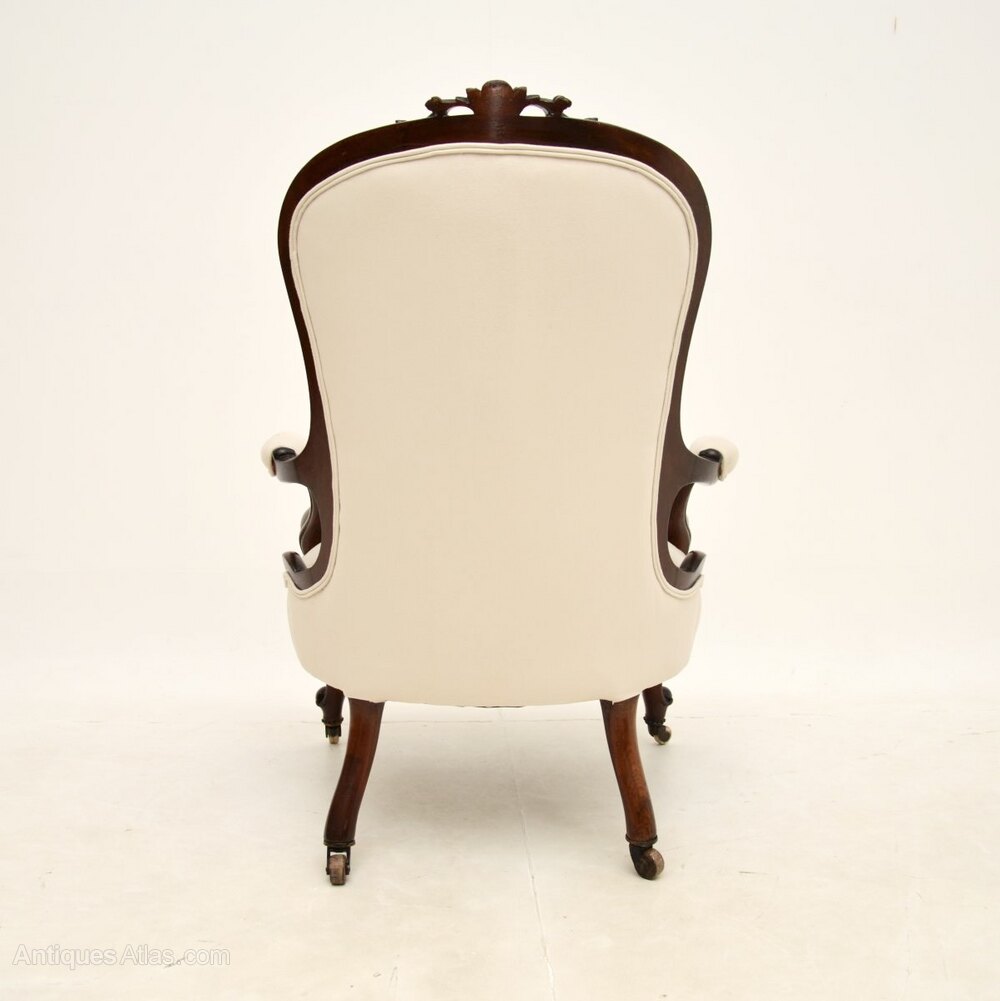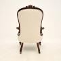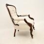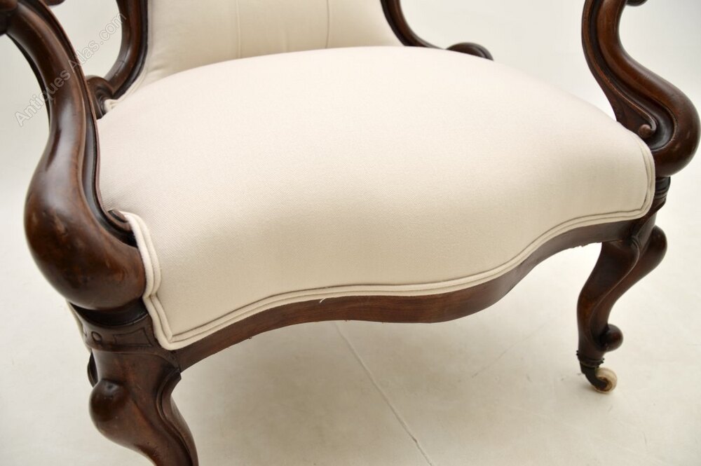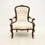 An excellent antique Victorian mahogany spoon back armchair. This was made in England and it dates from around the 1860-1880’s period.The quality is fantastic, it is very well designed and is also extremely comfortable. The solid mahogany frame is very well carved and has a sweeping look. The scroll over arms are beautifully curved and have padded upholstery, this sits on original porcelain casters.