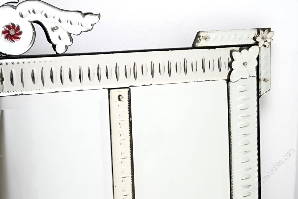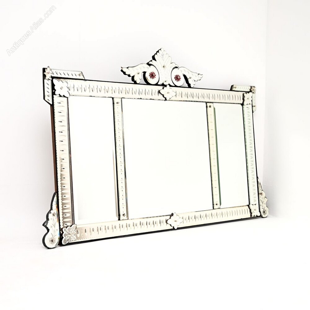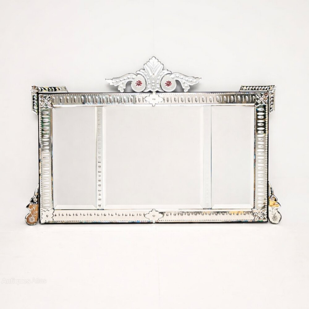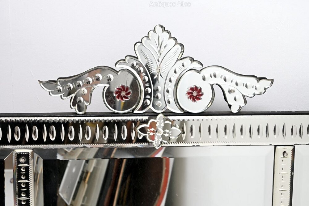 An extremely impressive & large antique Italian Venetian etched glass mirror, dating from around the 1900-1920 period.The quality is outstanding, this is beautifully made with an absolutely gorgeous design. There are wonderful etched patterns and this has added decorative mirrored pieces on the top, sides and bottom, with two small accents in red glass.