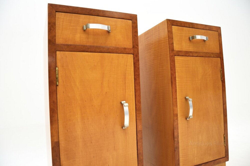 A sleek and stylish pair of Art Deco satinwood and walnut bedside cabinets. They were made in England, they date from the 1930’s.They are of amazing quality and are a very useful size. They are tall and narrow, offering plenty of storage space inside the drawers and cabinets. They are predominantly satinwood, with beautiful burr walnut banding around the edges. The grain patterns and colour tones are absolutely gorgeous throughout.