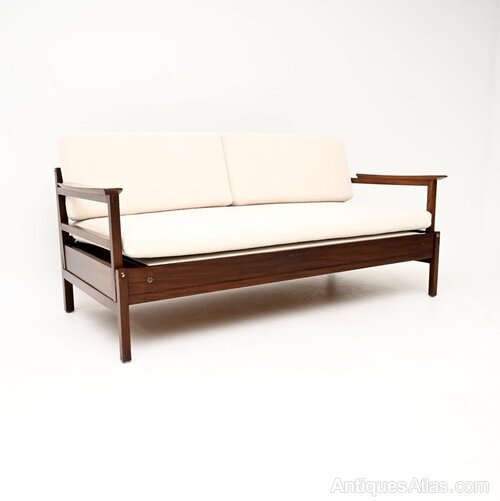 A stylish and very rare vintage Guy Rogers Gambit sofa bed. This was made in England during the 1960’s.The frame is solid afromosia wood, which has gorgeous grain patterns and a beautiful, rich colour tone.
