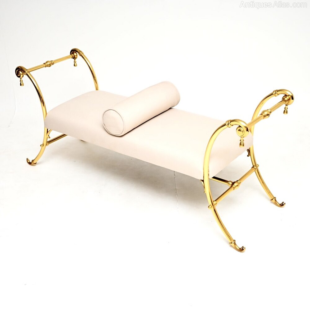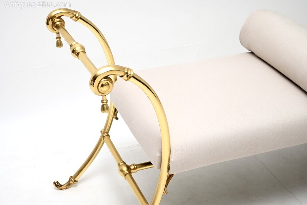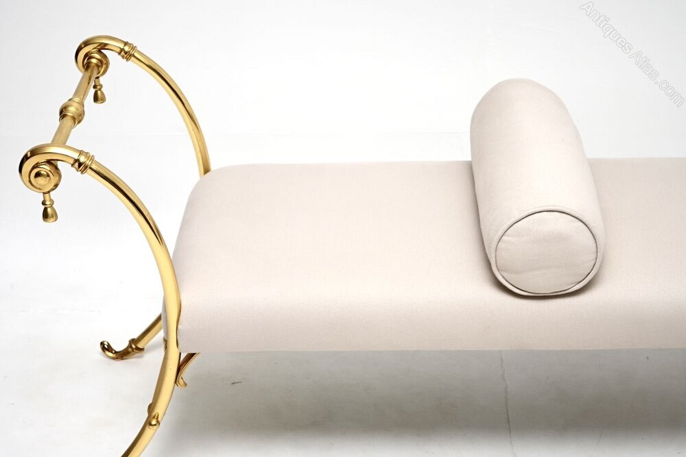 The condition is excellent for its age, with only some extremely minor surface wear to the brass frame. We have had this re-upholstered in a cream cotton fabric, the bolster on the centre of the seat is fixed.