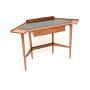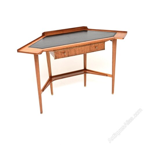 A stylish and very well made vintage mahogany leather top corner desk. This was made in England, it dates from the 1960’s.It is of superb quality and has a beautiful elegant design. It can be placed in a corner, against a wall or can be free standing, as the back is also nicely polished. It’s a lovely size, it would also make a very useful dressing table.