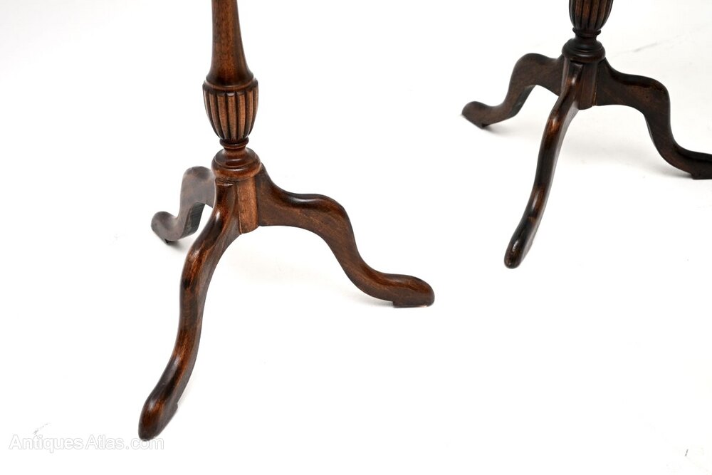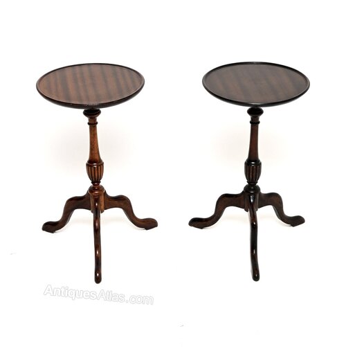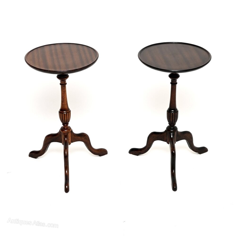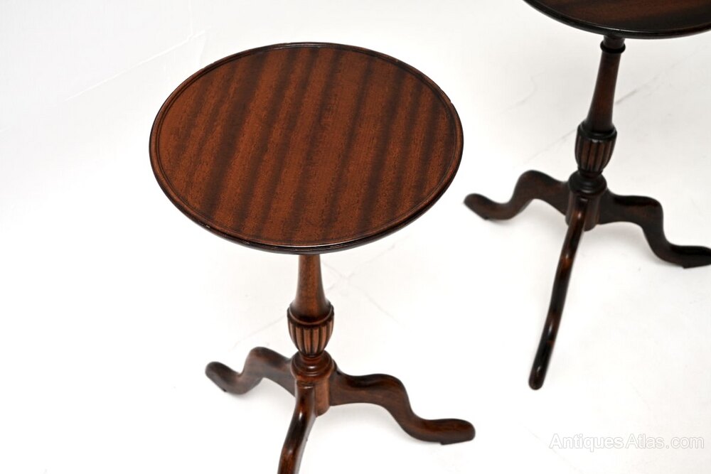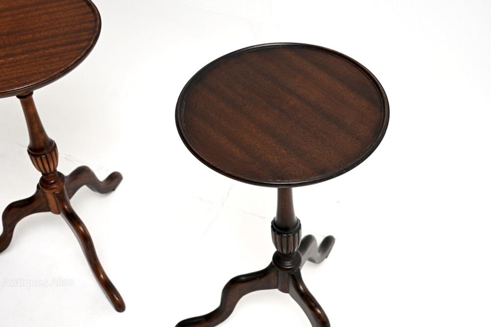 A smart and extremely well made pair of antique mahogany wine tables. They were made in England, they date from around the 1900-1920 period.They are of superb quality and are a very useful size. They are perfect for resting drinks and objects, they are petite and easy to move around. The circular tops stand on tripod bases, they are sturdy and sound.