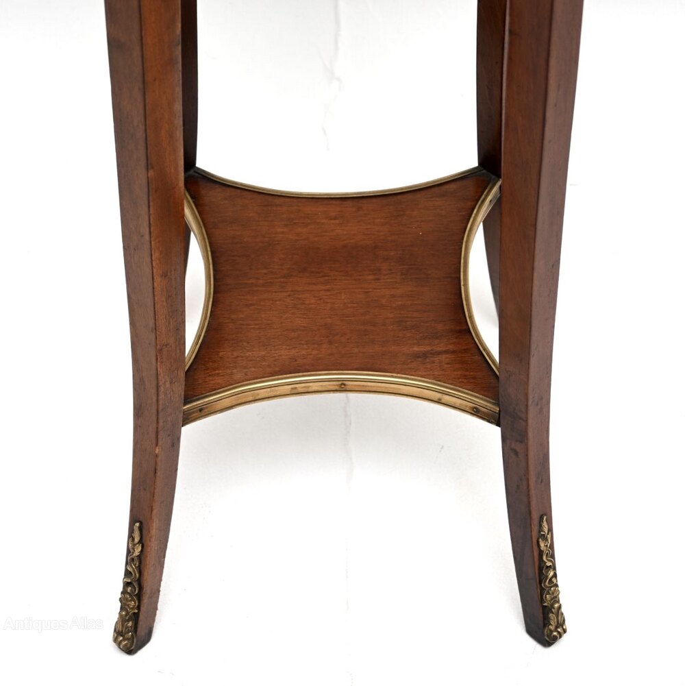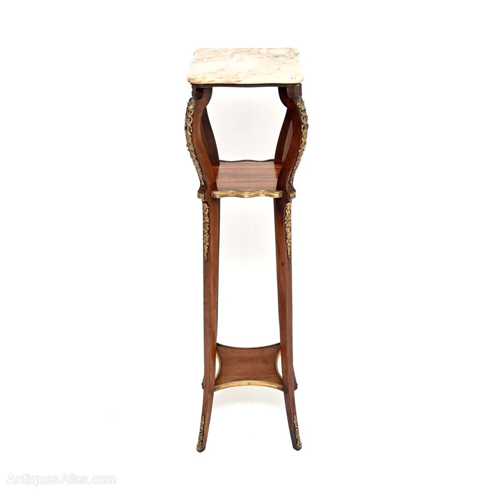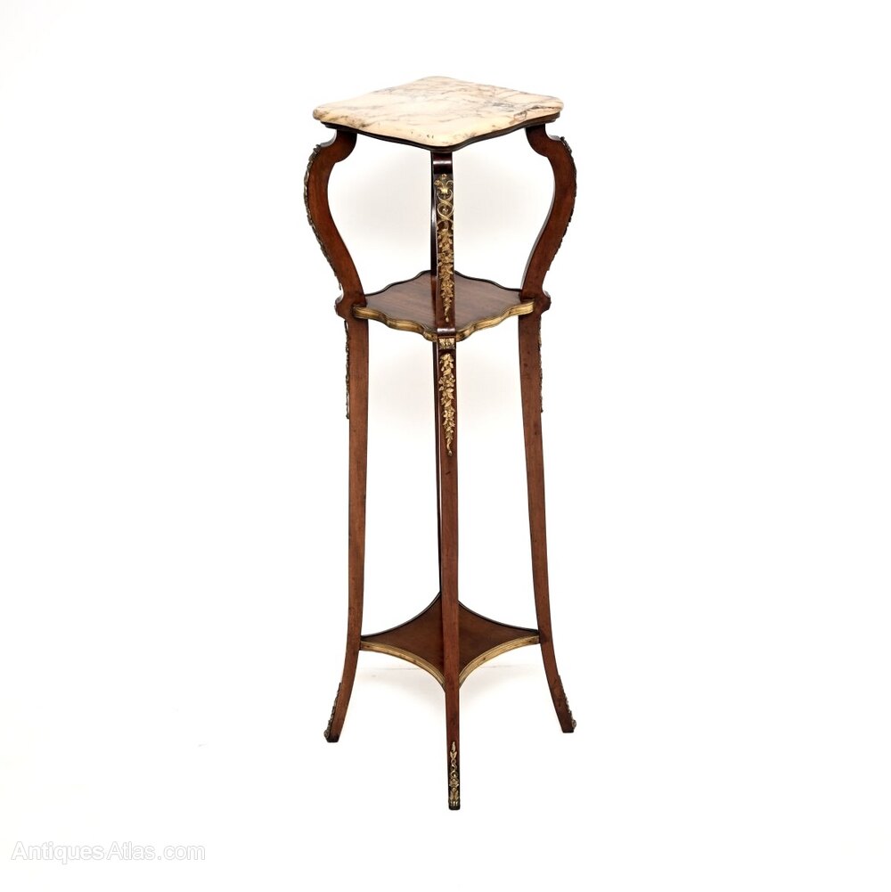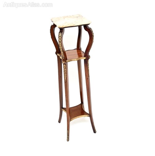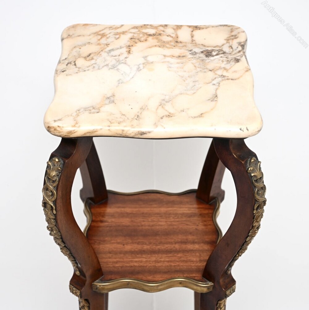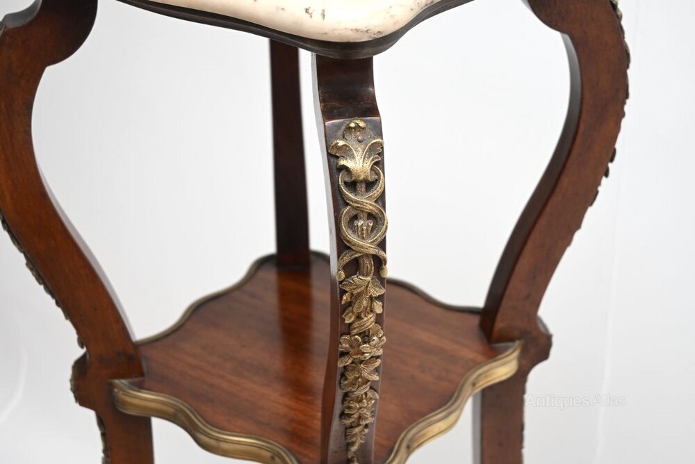 A beautiful antique French marble top mahogany jardiniere stand, dating from around the 1890-1910 period.It is of superb quality and is beautifully designed, perfect for holding plants, lights or objects. The mahogany frame is elegant yet sturdy, there are two useful lower tiers and a gorgeous fixed marble top with serpentine edges. This also has very high quality gilt bronze ormolu mounts throughout.