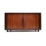 A very useful and extremely well made Danish vintage rosewood tambour door cabinet / sideboard by Dyrlund. This was made in Denmark, it dates from the 1970’s.The quality is outstanding, it is beautifully constructed with amazing rolling tambour doors. The rosewood grain patterns are lovely, this is even beautifully finished on the back. The interior contains useful storage space with an internal drawer, fixed shelf and a shelf that rolls out for media equipment. Each cabinet section also contains a small hole at the bottom for feeding wires through, with original rosewood discs to plug the holes when not in use. This rolls smoothly on strong casters.