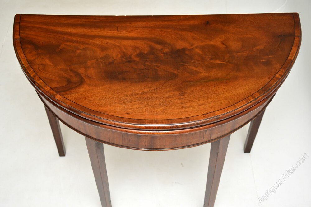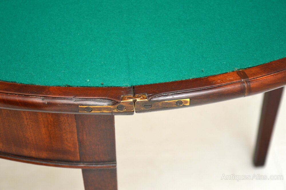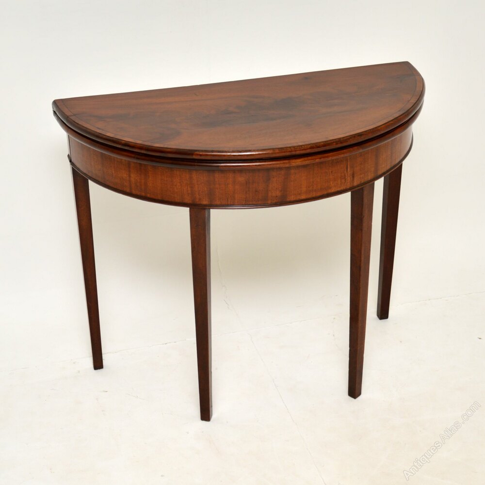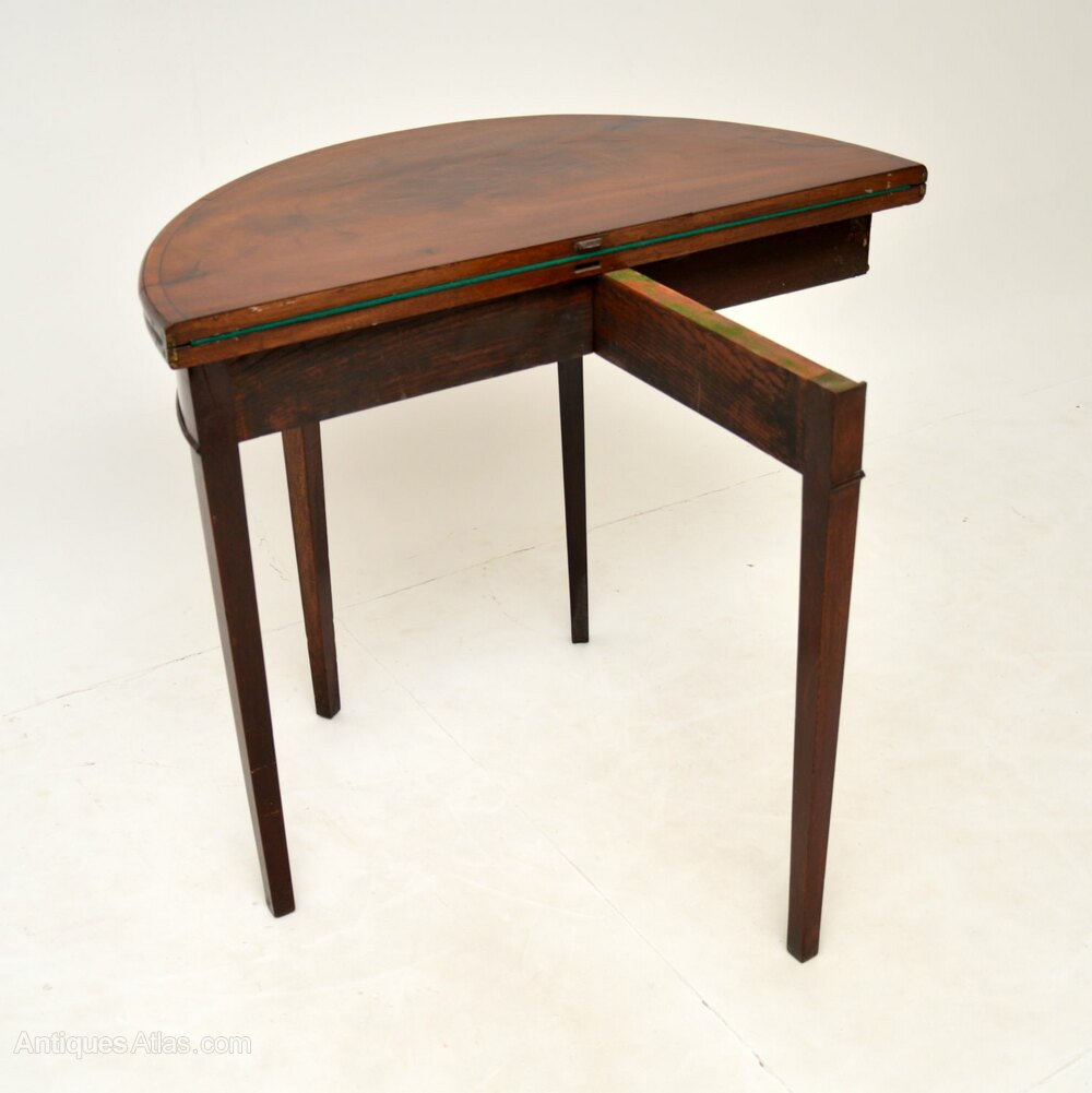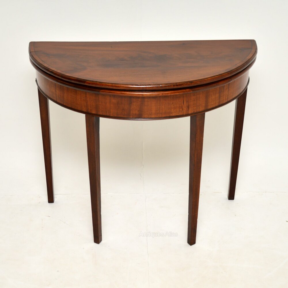 An elegant antique George III card table dating from around the 1790’s period.It has a beautiful design and is a very useful shape. When closed it is perfect for use as a demi-lune console table. When opened it turns into a lovely circular card table which seats four. The back leg swings out to support the playing surface.