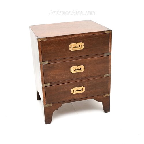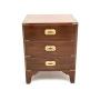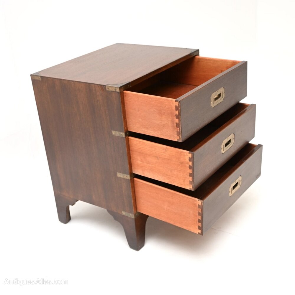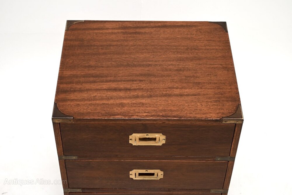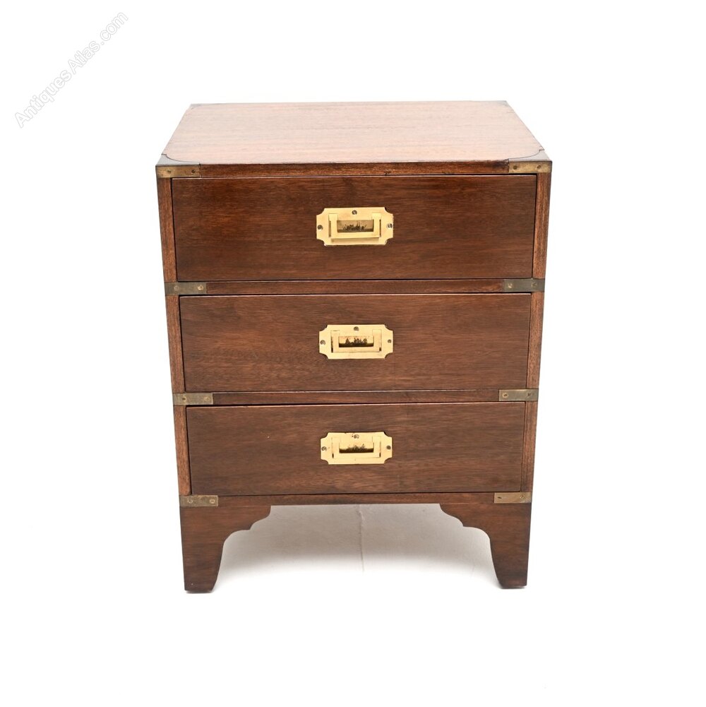 A smart and compact antique mahogany military campaign style chest of drawers. This was made in England, it dates from around the 1930’s.The quality is superb, this is a lovely and useful size, perfect for use as a bedside chest or side chest anywhere around the home. The mahogany has a gorgeous colour tone and patina, offset beautifully by the brass handles and brass fixtures. There is plenty of storage space in the three generous drawers, this sits on nicely shaped bracket feet.