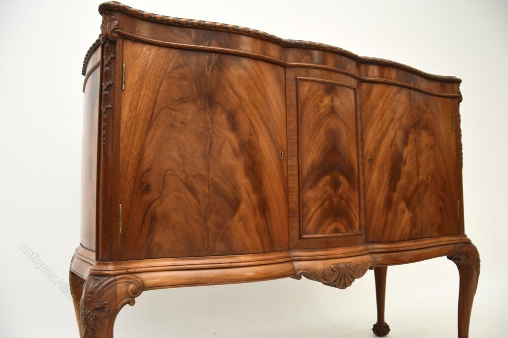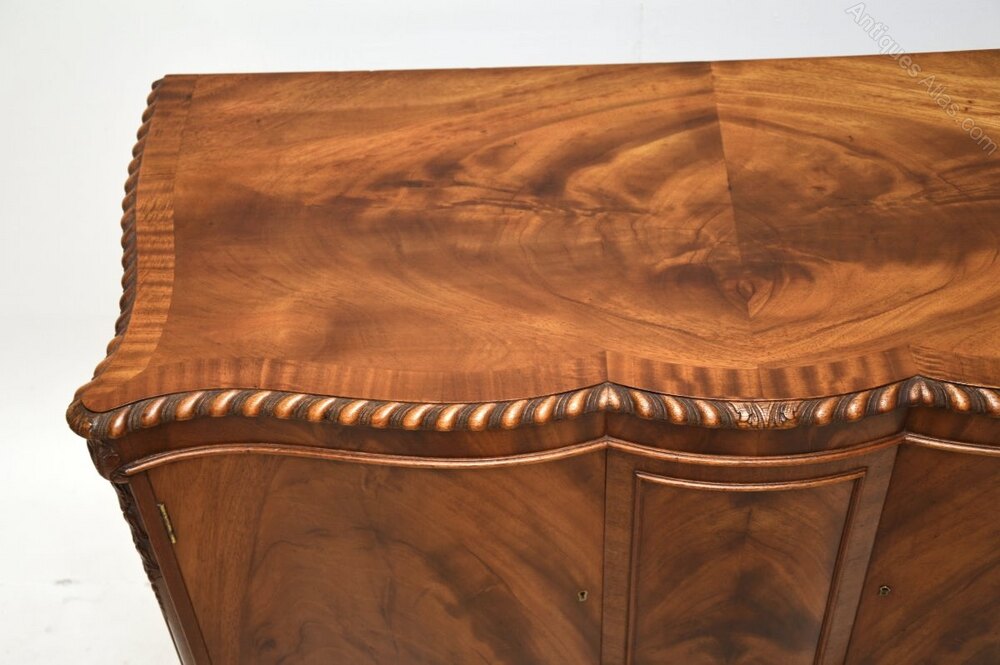 A beautiful antique mahogany serpentine cabinet in the Georgian style. This was made in England, it dates from around the 1900-1910 period.It is of superb quality and has a gorgeous design. There is a panelled centre flanked by two doors with beautiful flame mahogany grain patterns. This sits on cabriole legs terminating in claw and ball feet, the top is cross banded and has crisp gadrooned carving around the edges. There is also lovely carving to the outer edges, the colour tones and mahogany grain patterns are stunning throughout.