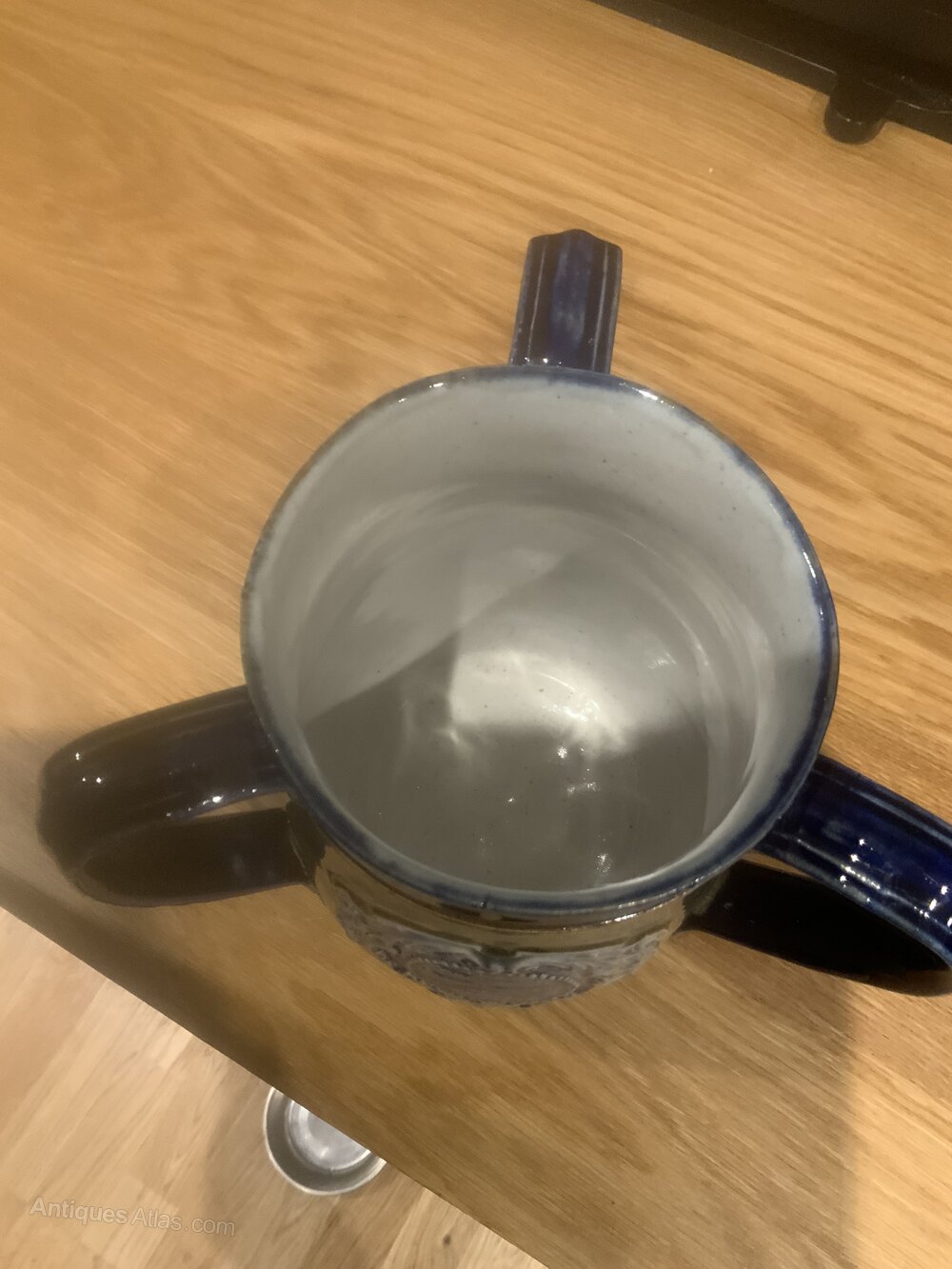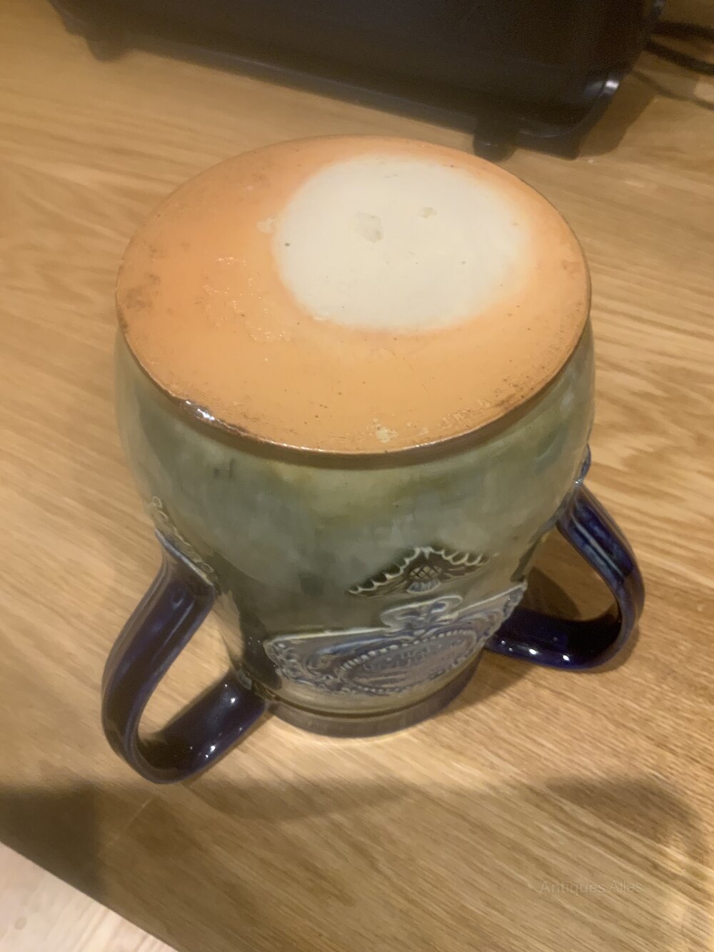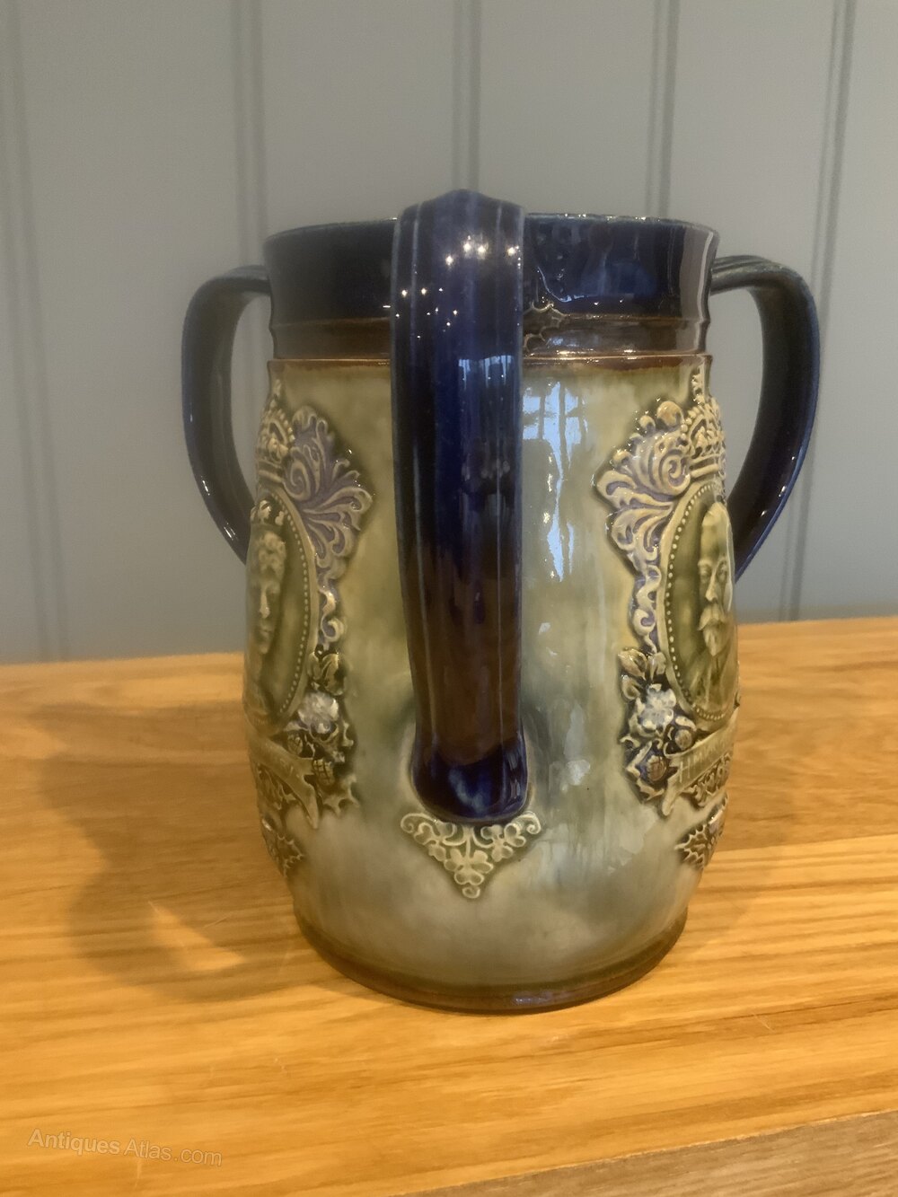 Deep blue border with three blue handles, lovely green glazed gound embossed with royal faces and crowns
