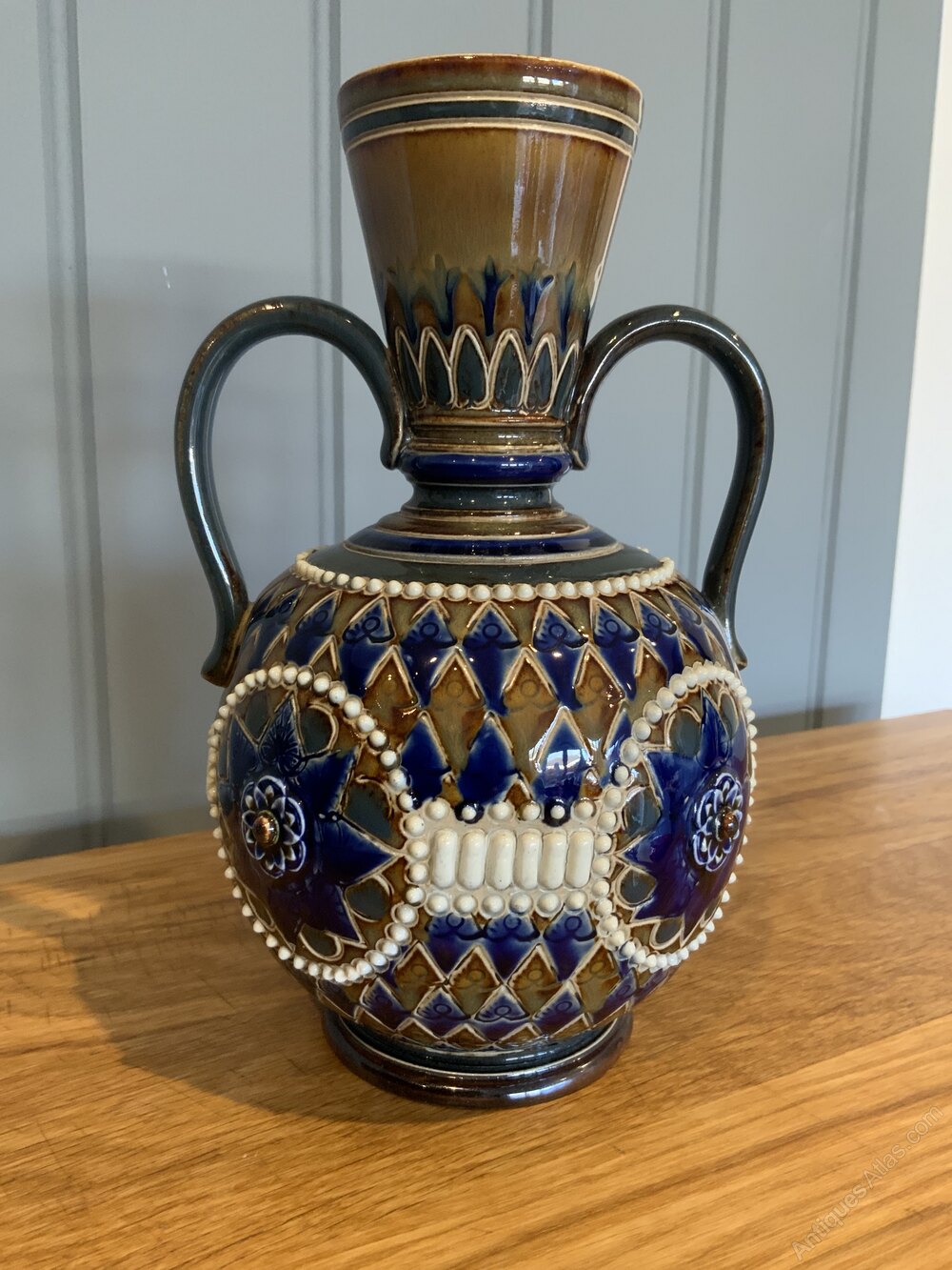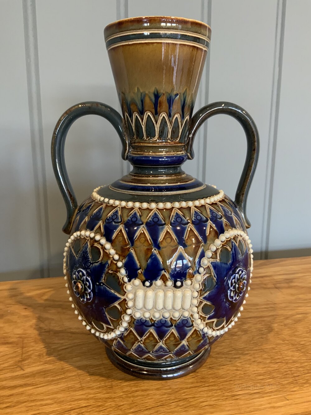 Superb Rare Victorian Doulton Lambeth Twin Handled VaseConcentric patterns embossed all around the body.