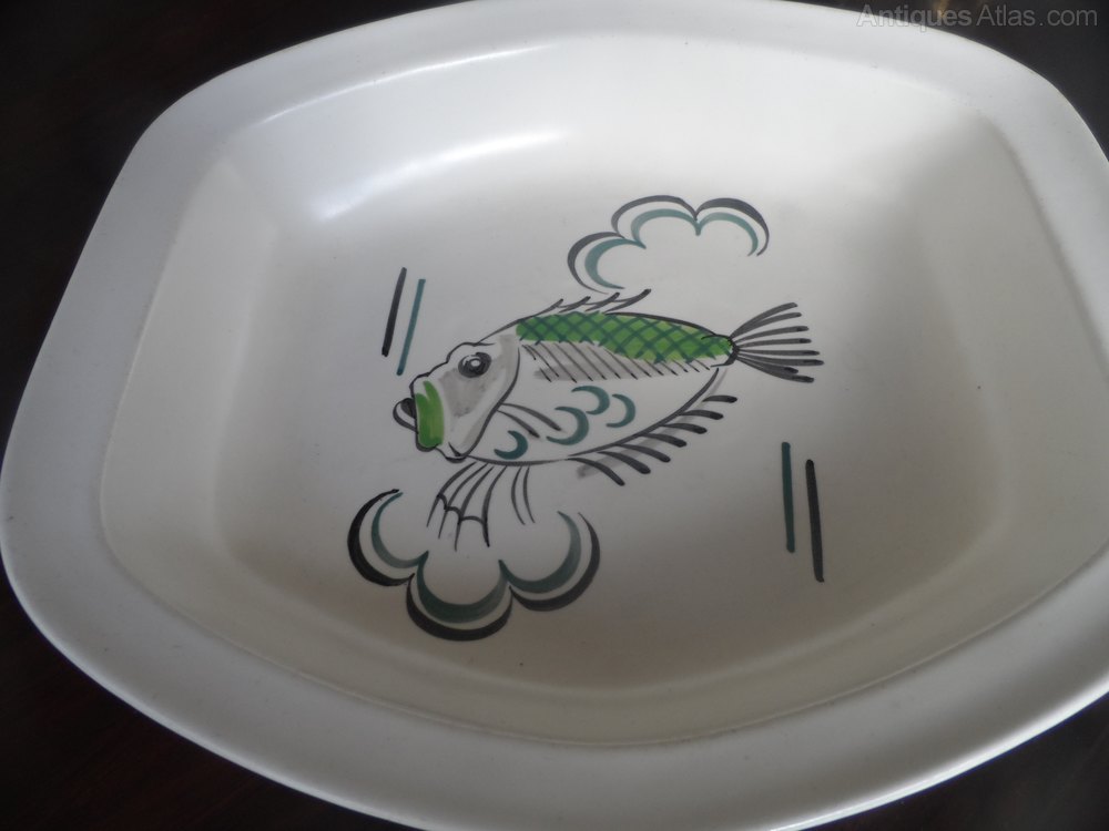 Vintage Poole Pottery deep casserole dish.Patterned wit a green puffa fish in a lovely painted style signed up to the back pictures shown.