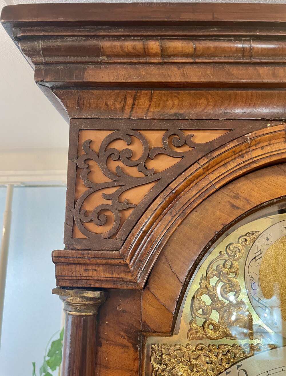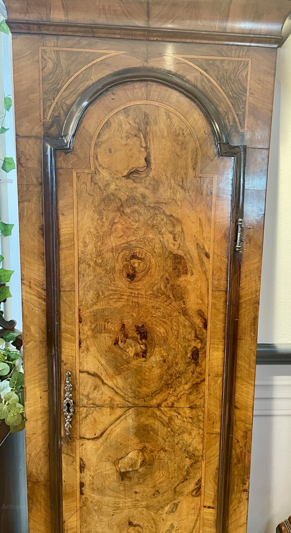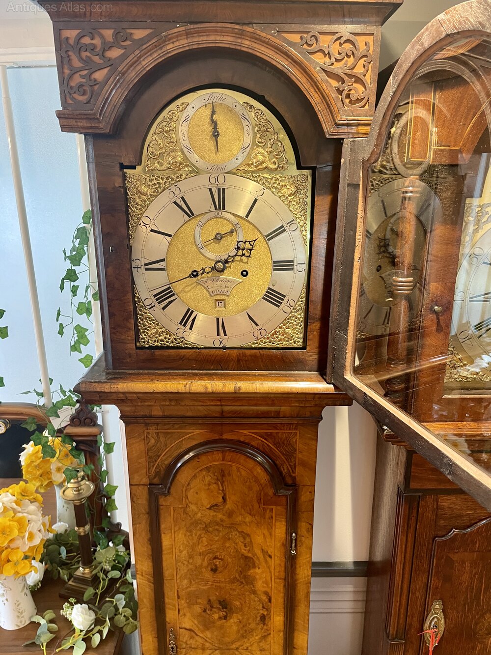 William Webster of London: 18th century 8 day longcase clock by this renowned maker.The case is mahogany with burr wood veneer panels. the hood is flat topped with a brass dial with decorative spandrals.