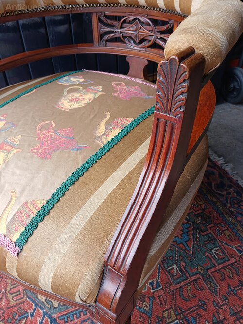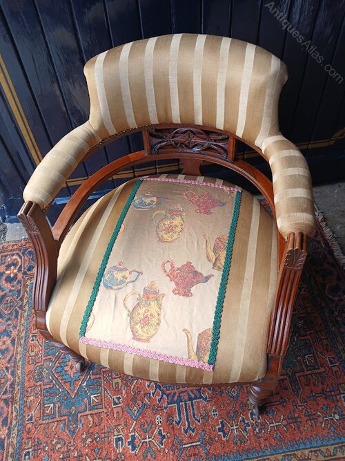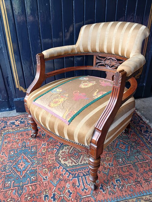 Elegant English Edwardian walnut upholstered tub shaped arm chair, circa 1910. Well made , comfortable, and has a pleasing 'country house' charm.Always an eclectic array of Antique and Vintage Goods in stock, please phone before travelling to view. follow us on face book/ Michael Allcroft Antiques. Any Enquiries Please Contact. Established since 1986, Third generation Antique Dealer