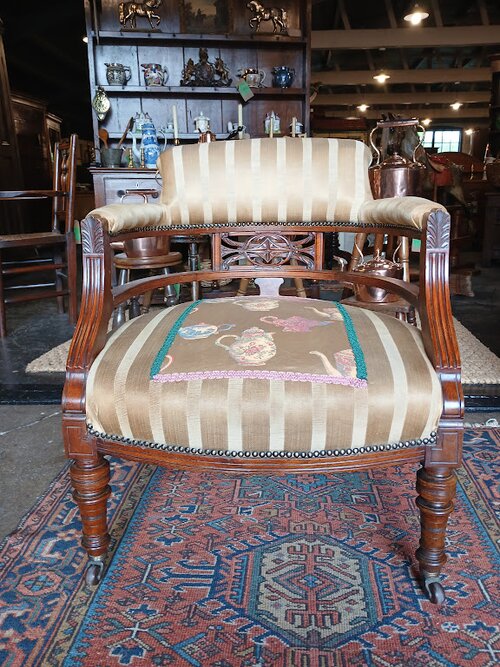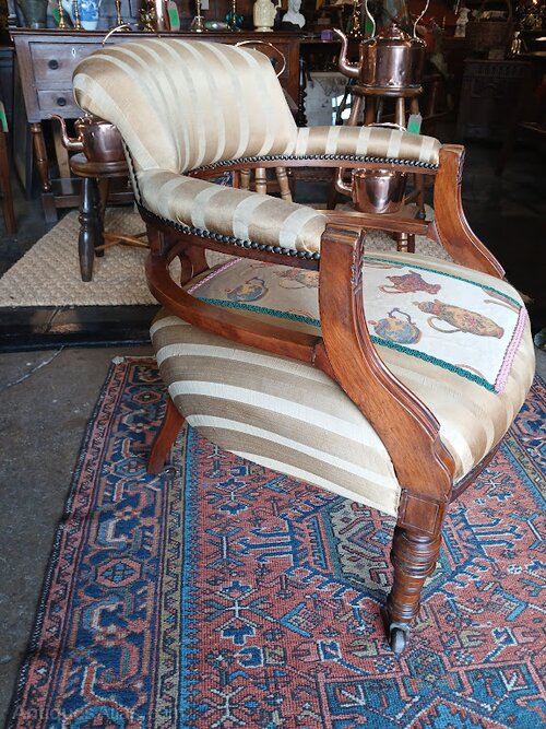 ConditionFine looking chair, the upholstery is 'shabby' and worn in places. However it doesn't detract from the item, but further adds to its charm.