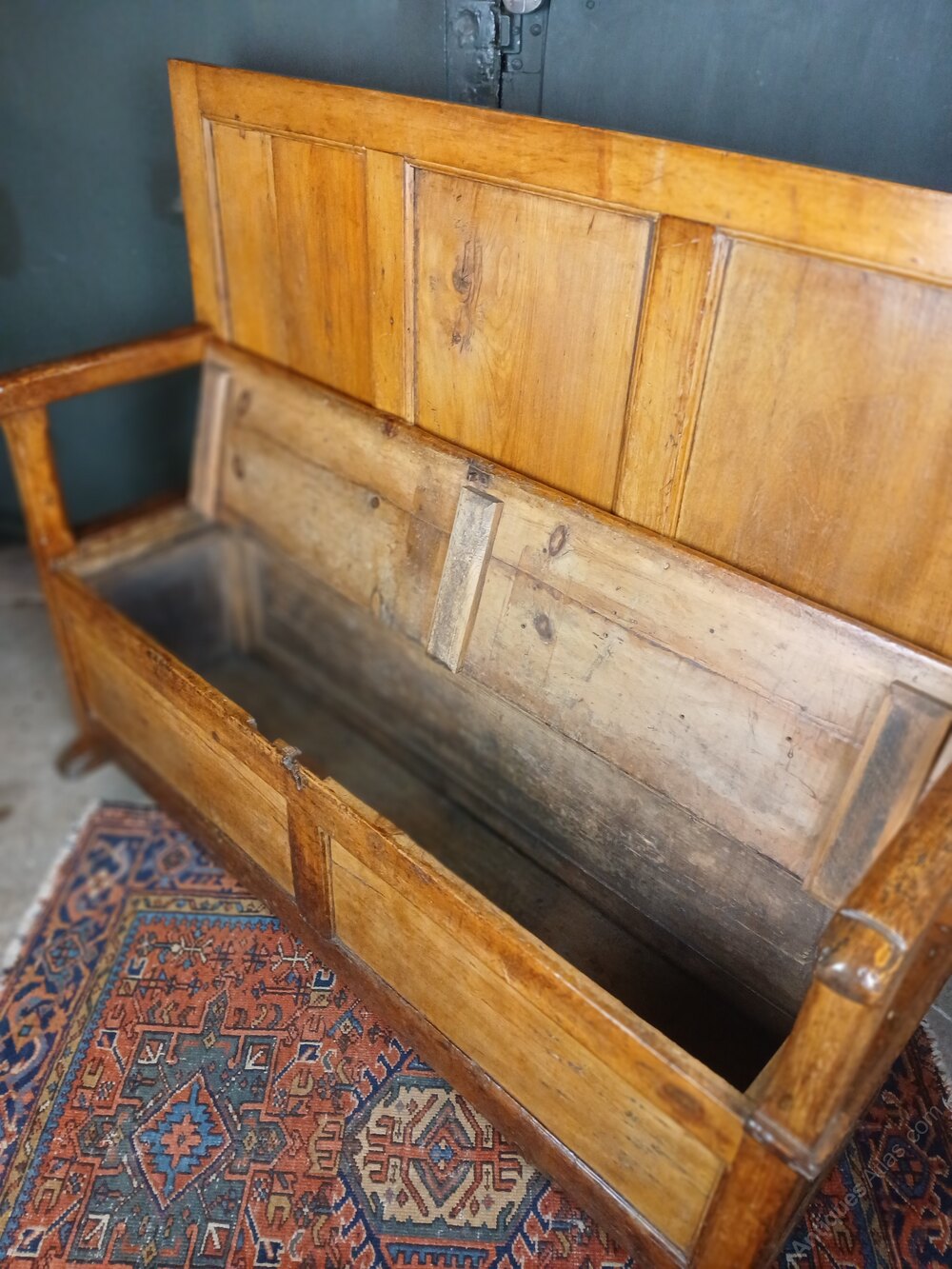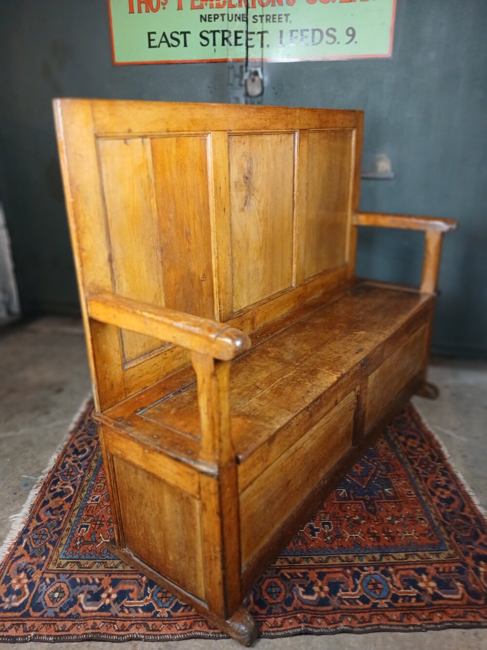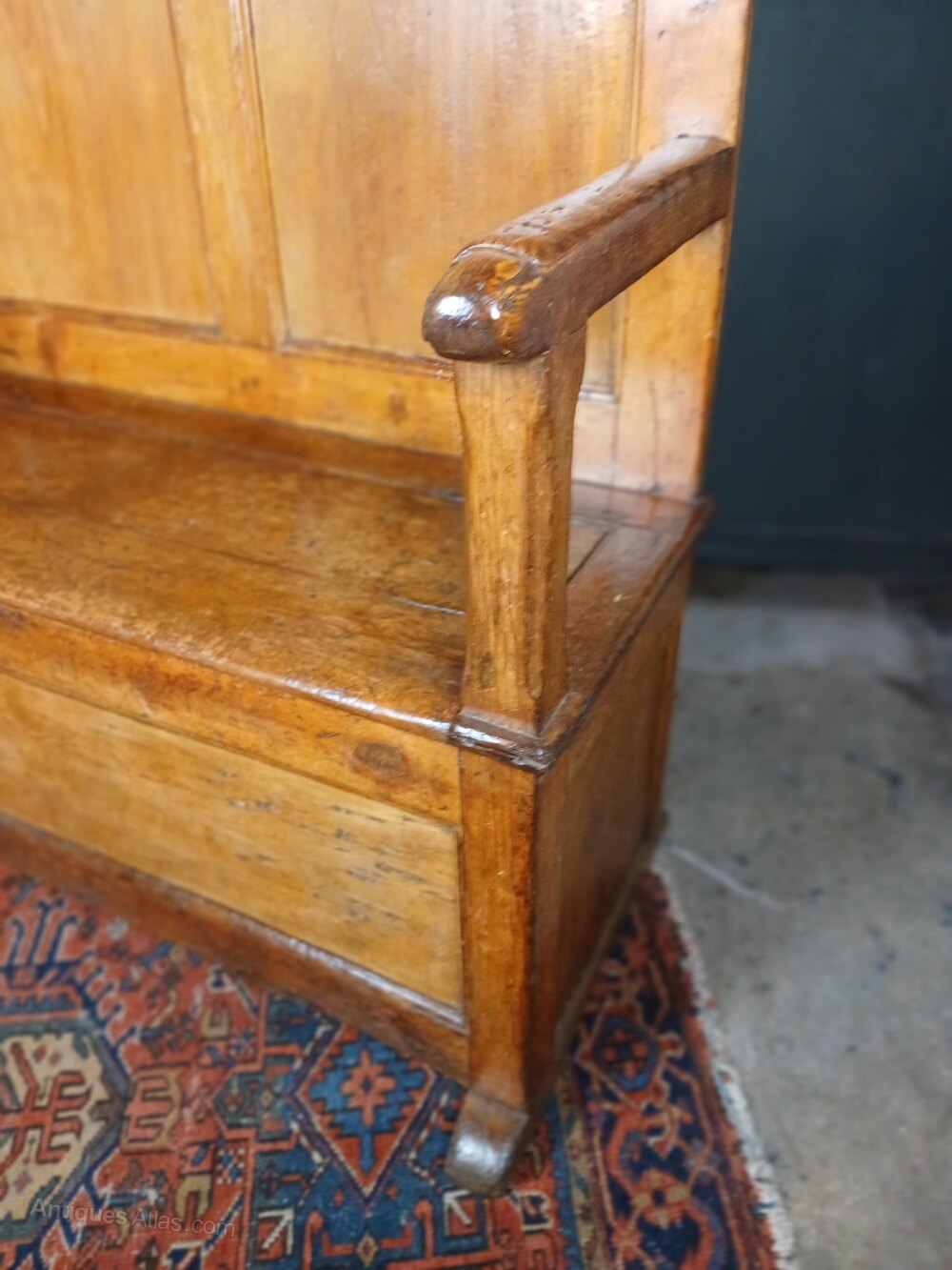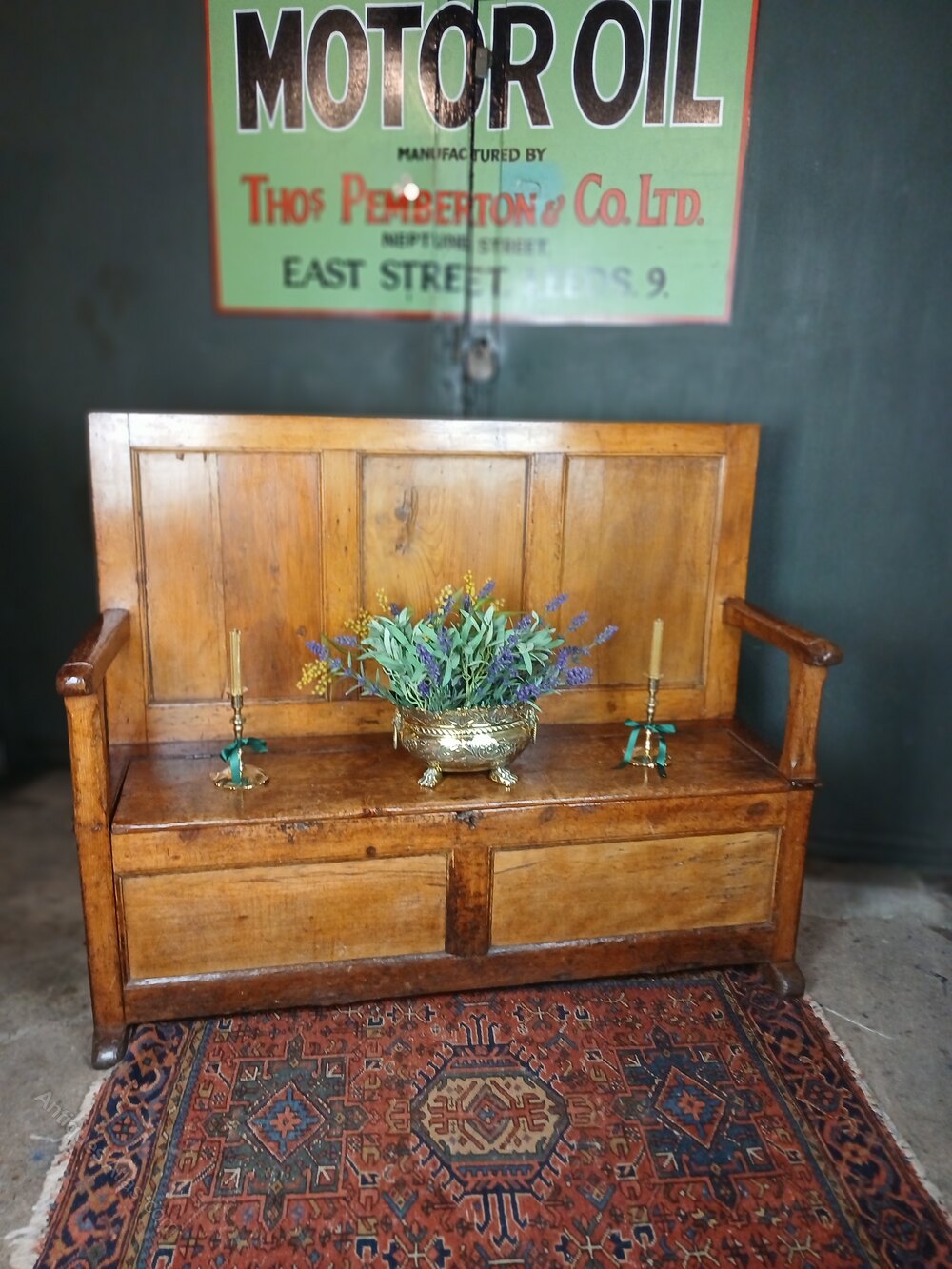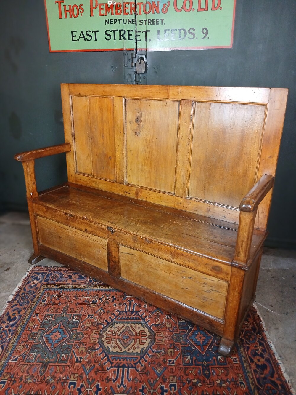 Delightful Georgian Welsh 'box seat' pine settle.A super looking early 19th century piece of Antique Welsh country furniture that boasts style and practicality with its tall panelled back and benefitting from its hinged lidded box seat that when opened reveals handy spacious storage for perhaps your boots, shoes or wellies.