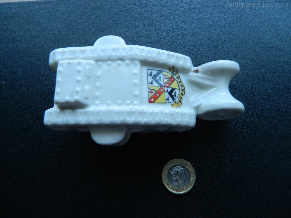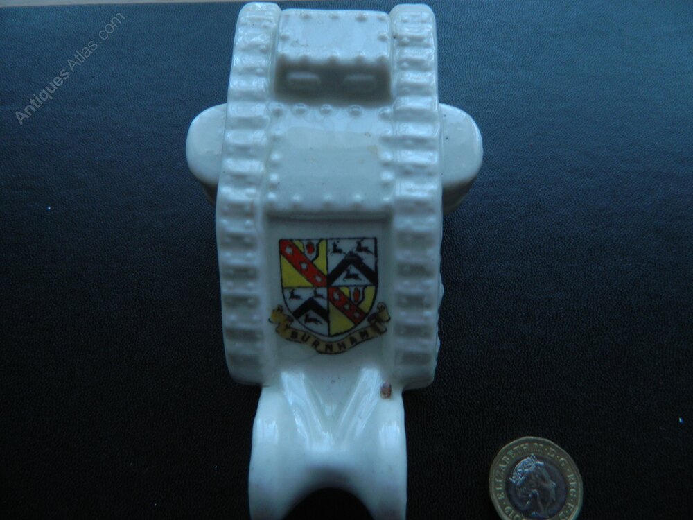 A crested ware model of a Tank with the legend Burnham. There are no chips or cracks but the base is well rubbed.Post will be £4.99DateEarly 20th Century